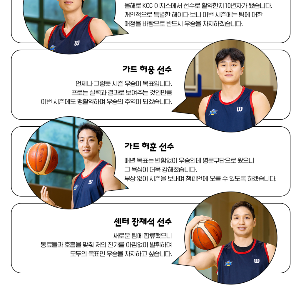 우승이라는 모두의 목표를 향해 순항 중인 KCC 이지스 호를 10년째 든든히 지키고 있는 송교창 선수의 역할도 기대가 된다. 지난 해 부상으로 마음 고생이 컸을 송교창 선수는 “좋은 선수들이 많이 모여서 기량이 훨씬 좋아졌으니 저도 부상 관리에 신경 쓰며 우승에 일조하고 싶습니다.” 라고 밝혔다. 무엇보다 송교창 선수는 팀 내에서 선수 간 단합과 의지를 단단히 하는 정신적인 버팀목이 되기를 희망했다. 트레이드를 통해 팀에 합류한 장재석 선수의 목표도 딱 하나 우승이다.