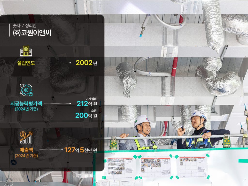 건물의 내구성을 높이는 요인은 아주 다양하다. 그 중에서도 건물 전체를 관통하면서 급배수는 물론 오폐수를 배출하고, 냉난방과 환풍기를 통해 쾌적함을 더하며, 화재에 효율적으로 대응하는 것 등이 있다. 이 모든 것이 배관과 덕트 등 기계시설을 통해 이루어진다. 가장 기본적이면서도 마치 인체의 혈관 같은 기능을 하기에 핵심시설이 되는 것. ㈜코원이앤씨는 바로 이 분야에만 집중하며 20여년 남짓 사업을 이어오고 있다. 배관과 덕트 등의 기계설비 분야는 무엇보다 중요한 것이 우수한 시공능력을 갖춘 숙련된 작업자로 구성된 인력과 도면에 맞추어 원리원칙을 지키며 하자가 발생하지 않도록 작업하는 것이다. ㈜코원이앤씨는 당연하지만 준수하기 쉽지 않은 이 사항을 충족하며 작업한다. 정도를 지키는 기업이라는 것이다.