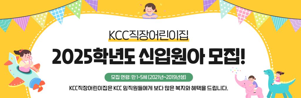 KCC 직장어린이집은 임직원들의 일 가정 양립을 위해 제공되는 복지 사업의 일환으로 직장과 가까운 거리에서 부모와 자녀가 함께 출근하여 강남 한복판에 안전하고 즐거운 놀이/자연환경 속에서 소중한 아이들이 자라날 수 있도록 지원하고 있다.![]()