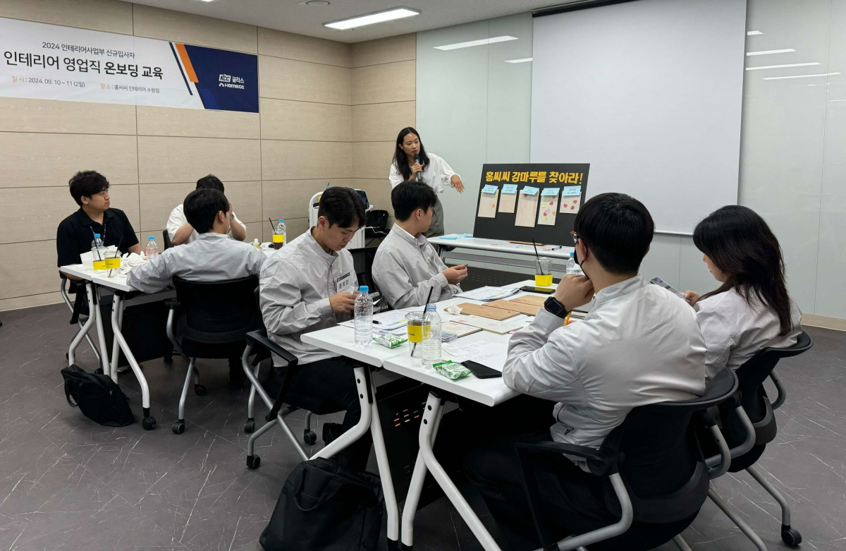 온보딩 교육은 신규 입사한 인테리어 영업직 임직원이 빠르게 회사 문화와 업무를 익히고 적응해 핵심 인재로 성장할 수 있도록 돕는 입문 교육 프로그램이다. 교육팀에서는 기존 우수 실적 인테리어 영업직의 개별 인터뷰를 통해 ‘인테리어 영업직 4대 핵심 역량’을 활동량, 전문 지식, 견적 대응, 성취 추구로 모델링했다. 이와 같은 핵심 역량을 개발하기 위해 SCM 관점의 상품 전문지식, 거래선 공략 10단계 프로세스는 물론 영업사원으로서 가져야 할 기본자세 등을 기르기 위한 다양한 교육이 진행됐다.