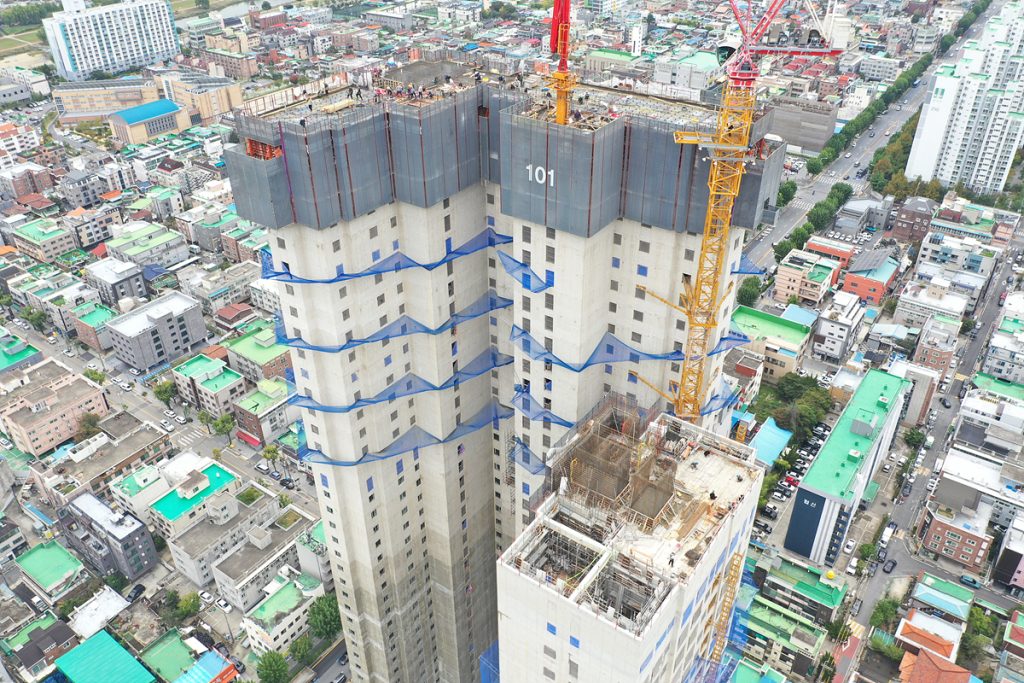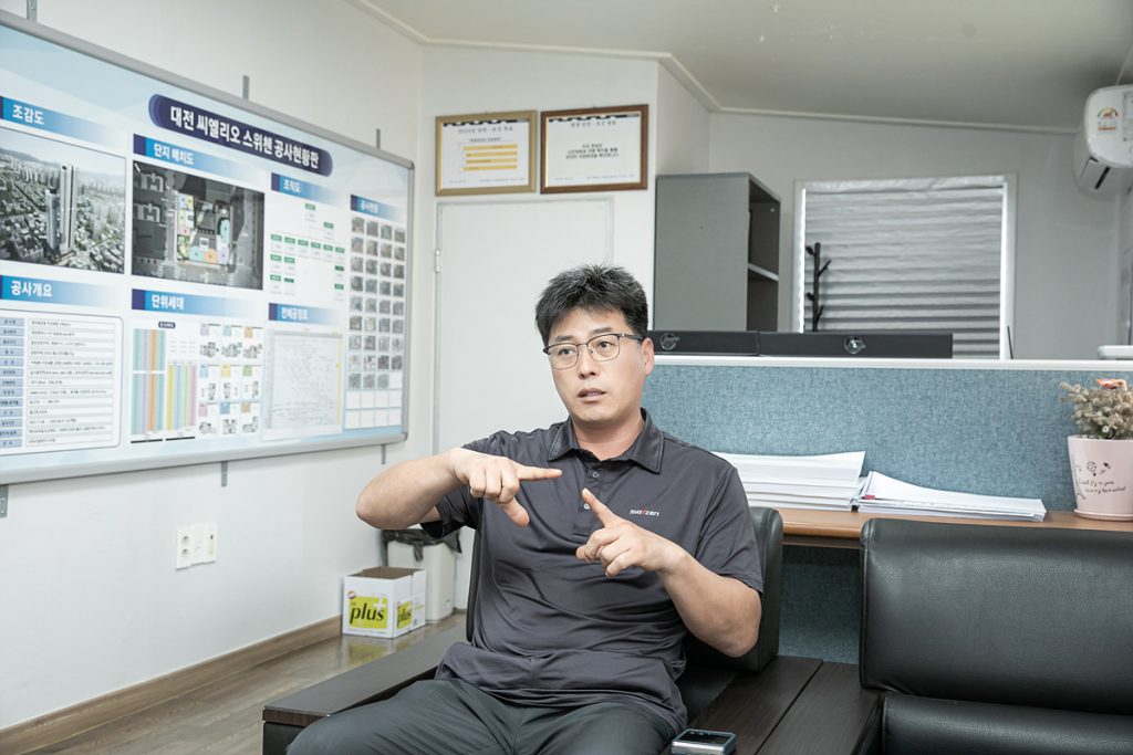 현재 대전 씨엘리오 스위첸 현장은 61.5%의 공정률을 보이며 순항 중이다. 오피스텔 동은 이미 29층 시공이 완료됐고, 아파트 동 역시 최상층인 40층 시공을 눈앞에 두고 있다. 내부 공사는 아파트와 오피스텔 각각 24층과 20층까지 바닥 미장이 완료되었으며, 외부 석공사도 진행 중에 있다. 그렇다고 지금까지 순탄하게만 흘러온 것은 아니다. 착공 초기, 흙막이 공법 변경과 물가 인상에 따른 자재비 상승, 노조 파업 등의 다양한 어려움을 겪었기 때문이다. 토질 문제로 인해 약 2개월의 공기 지연도 있었고, 철근콘크리트 공사 중에는 창호 수급 불안과 소음으로 인한 민원 문제도 발생했었다.