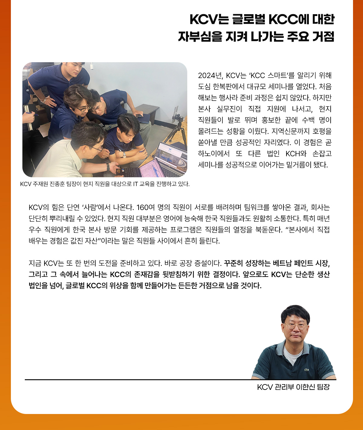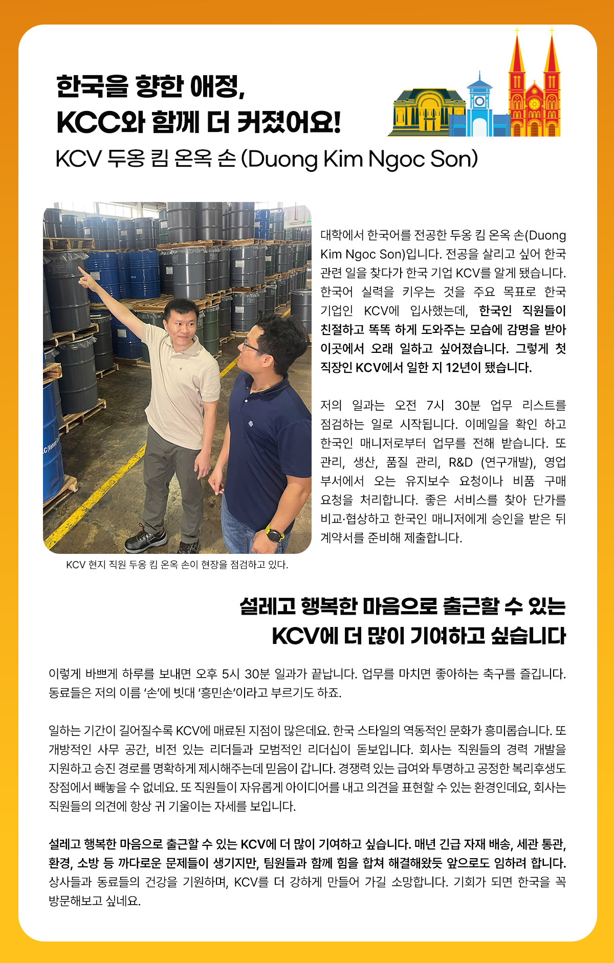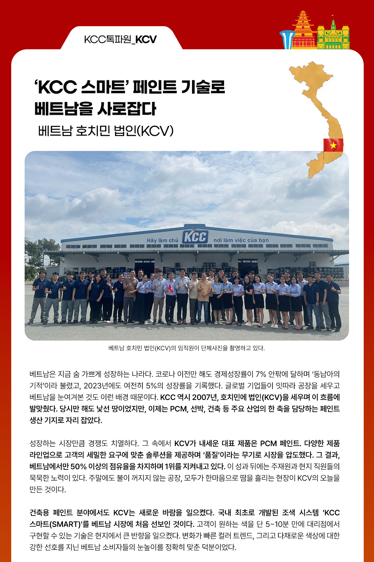 글로벌 기업 KCC는 전 세계 여러 나라에서 다양한 현지 법인을 운영하고 있습니다. 이곳에서 한국인 직원과 현지 직원들이 함께 어우러져 KCC의 내일을 만들어 갑니다. 바다 건너 먼 나라에서 열정적으로 일하는 KCC 구성원들의 재미있고 따뜻한 이야기를 ‘KCC 톡파원’을 통해 만나보세요!