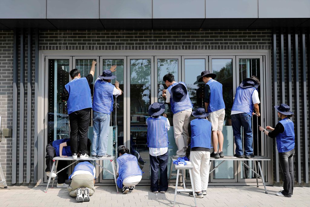 ‘구해조(鳥) KCC글라스’ 캠페인 참여자들이 아차산숲속도서관에 조류충돌방지스티커를 부착하고 있다.