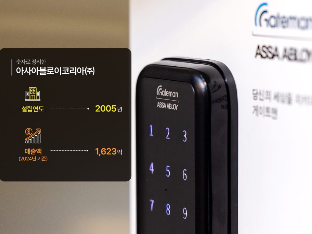 1994년에 설립된 아사아블로이 그룹은 스웨덴에 본사를 둔 액세스 솔루션 분야의 글로벌 리더로, 전 세계 70여 개국에서 사업을 전개하며 2024년 기준 약 123억 유로(약 20조 원)의 매출을 기록했다. 국내에서는 2005년 아사아블로이코리아㈜를 설립해 도어체크 분야에서 높은 시장 점유율을 자랑하는 킹, 방문 손잡이 시장의 강자로 자리매김한 엔젤, 그리고 K-BPI(한국산업의 브랜드파워) 조사에서 스마트 도어락 부문 1위를 무려 20년 연속 지키고 있는 게이트맨 등 여러 브랜드를 운영하며 국내 시장에서도 눈에 띄는 성장을 이뤄냈다.