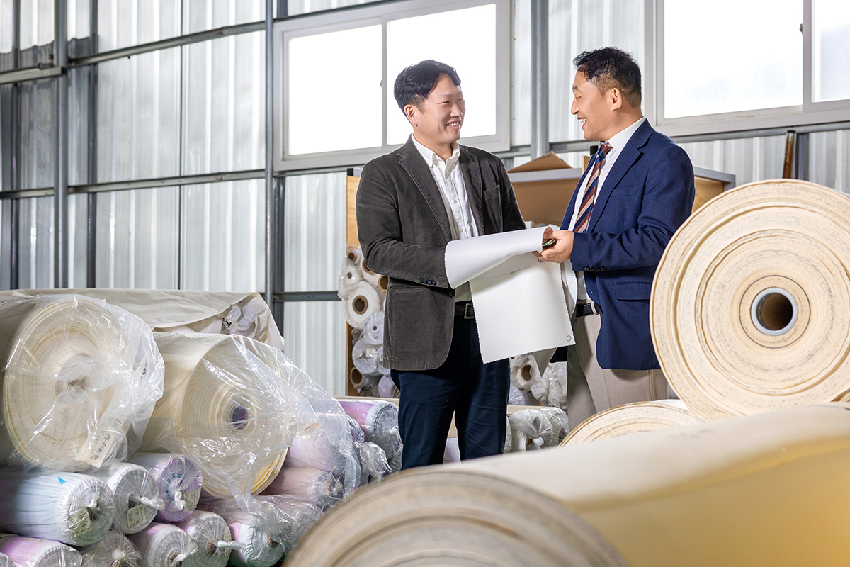 실리콘 코팅에 관한 특허 기술로 오래된 업력을 자랑하고, 전 세계에서 유일하게 실리콘 양면 코팅 기술을 보유할 만큼 뛰어난 기술력을 지닌 ㈜비에스텍에도 어려움은 있었다. 실리콘을 가죽이나 합성 피혁의 질감과 비슷하게 구현하려면 특유의 끈적임을 부드럽게 바꿔야 하는데, 원하는 스펙의 실리콘, 그러니까 원재료를 개발할 수 없었던 것. 창업 이후 미국과 일본의 실리콘 업체에서 원재료를 공급받았지만, 글로벌 기업을 상대하기엔 작은 규모였기에 소통부터 쉽지 않았다. 험난한 길에 서 있던 ㈜비에스텍에 손을 내민 곳이 있었다. 전 세계 26개국을 돌며 제품을 홍보하는 열정적인 공 대표와 실리콘 코팅 원단의 가치를 알아본 KCC실리콘이다.