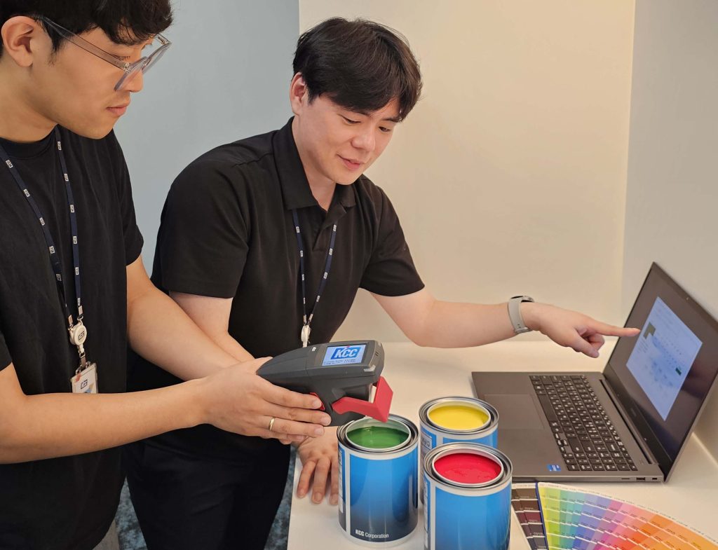 KCC(대표 정재훈)는 업계 최초로 AI 기반 ‘무도장 조색시스템’을 개발해 특허를 등록하고 제품 양산에 적용했다. 이 시스템은 고객사로부터 주문받은 도료(페인트)의 색상을 만들기 위해 실제로 조색1), 도장2)하지 않고도 조색에 필요한 색상을 예측 수 있는 AI기반 생산 및 조색 공정 플랫폼이다.