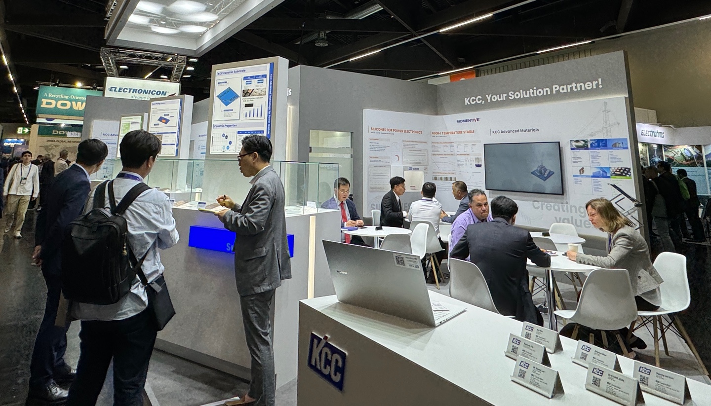독일 뉘른베르크에서 13일까지(6월 11일~13일) 진행되는 이번 전시회에서 KCC는 미래 핵심산업 중 하나인 전기차 구동 부품 및 파워모듈용 첨단 유∙무기소재와 글로벌 실리콘 기업 모멘티브의 실리콘 소재를 함께 선보이며, 전력반도체 소재 토털 솔루션을 제시했다.
