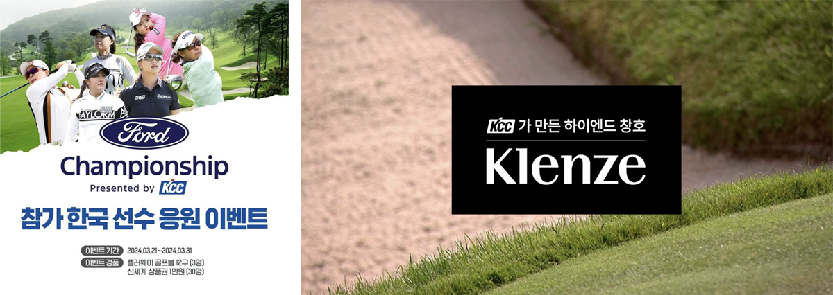 KCC는 이번 ‘포드 챔피언십 프리젠티드 바이 KCC’ 대회에 하이엔드 창호 브랜드 Klenze 광고 및 가상광고를 진행하였으며, SNS 프로모션 등 다양한 브랜드 마케팅을 펼쳤다.