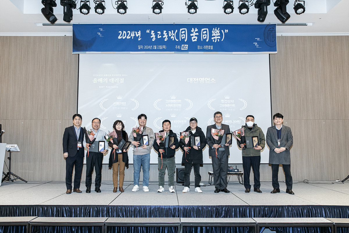 이어서 시상식도 진행되었다. 각 영업소와 지점에서 한 해 동안 KCC와 함께 동고동락한 거래선을 추천 받아 전국 총 122개 대리점을 ‘올해의 대리점’으로 선정하여 명패와 함께 시상했다. 또한 2023년 유통도료 연간 실적 10억 이상의 클럽 거래선에 대한 시상도 진행되었다. 총 23개 대리점에 대해 3개 클럽으로 나누어 시상하였으며 연간 실적 기준으로 10억 이상은 골드 클럽, 15억 이상은 플래티넘 클럽, 20억 이상은 다이아몬드 클럽으로 구분해 명패와 상금을 함께 시상했다.