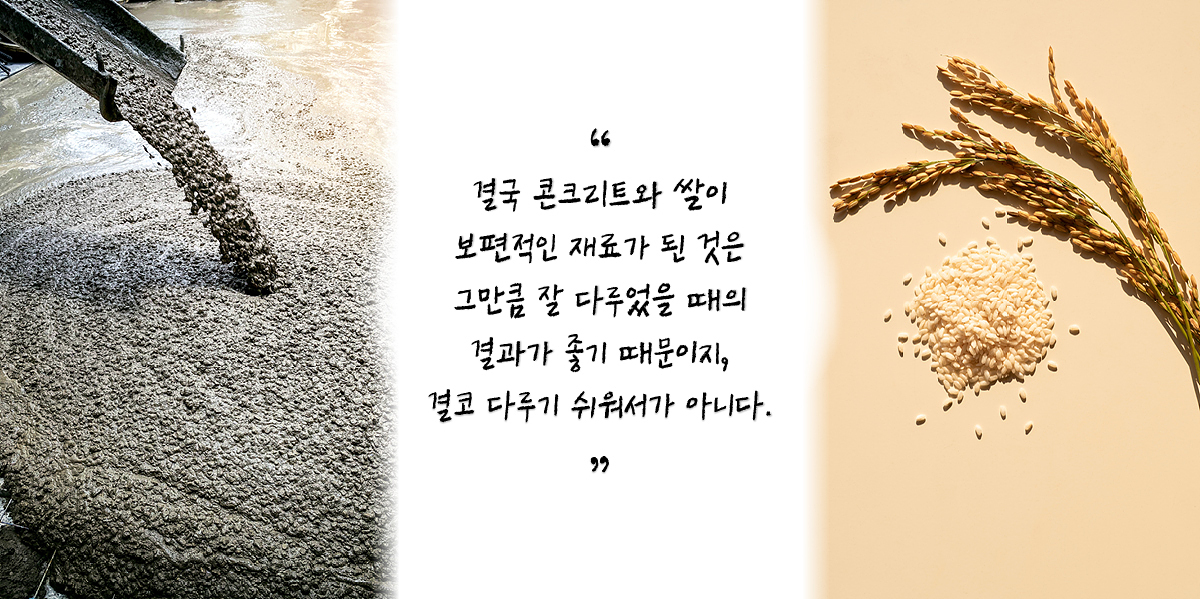 그렇다고 콘크리트와 쌀이 이상적인 재료는 아니다. 쌀밥이 아무리 맛있어도 그 자체로는 식사가 되지 못하고 영양 균형도 맞지 않는다. 콘크리트 역시 구조와 마감을 동시에 해결하는 장점이 있지만 이는 양날의 검과 같다. 한반도처럼 겨울과 여름의 온도 차가 심한 지역에서 바깥 공기에 노출된 콘크리트는 건강하기 어렵다. 여름에는 달궈지고 겨울에는 얼어붙는 과정을 반복하다 보면 크랙이 발생하고 이것은 철근의 부식으로 이어진다. 그래서 콘크리트 건물은 내단열 보다, 외단열과 그 바깥의 마감재로 콘크리트 구조체를 보호해 주는 게 옳다. 사람 몸도 구조체는 안에 있고 그 위에 단열재인 지방층과 마감재인 피부가 있는 것처럼 말이다.