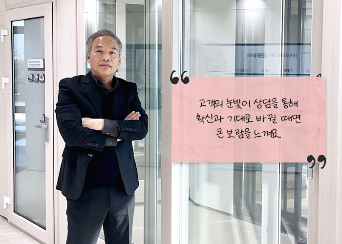 A: 고객분이 제게 연락하지 못하셨던 건 바쁜 저를 배려해 주기 위해서였어요. 그래서 그 얘기를 듣고는 감사하고 따뜻한 그 마음씨에 눈시울이 붉어졌죠. 자식 바쁠까 봐 연락을 망설이시는 저희 부모님 생각이 났거든요. 그날 바로 공구를 챙겨 들고 고객분의 집을 찾아가 창호가 부드럽게 잘 여닫히는지, 찬기가 새어 들어오지는 않는지 점검하고 주방과 욕실까지 둘러보고 나왔어요. 그제야 고객님이 “시공 잘했구나” 하시면서 안심이 된다고, 수고가 많다며 등을 토닥여 주시더라고요.