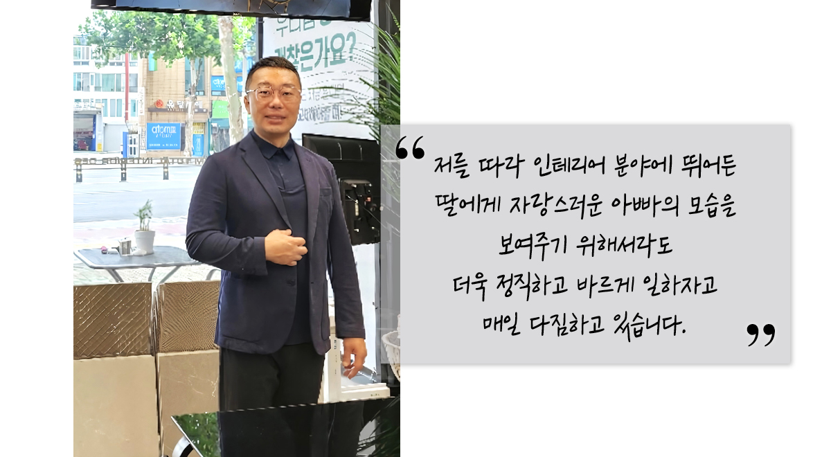 A: 지금처럼 최선을 다해 시공하며 사업을 이어가고 싶어요. 특히 어려운 일인데도 저를 따라 인테리어 분야에 뛰어든 제 딸에게 자랑스러운 아빠의 모습을 보여주기 위해서라도 더욱 정직하고 바르게 일하자고 매일 다짐하고 있습니다.