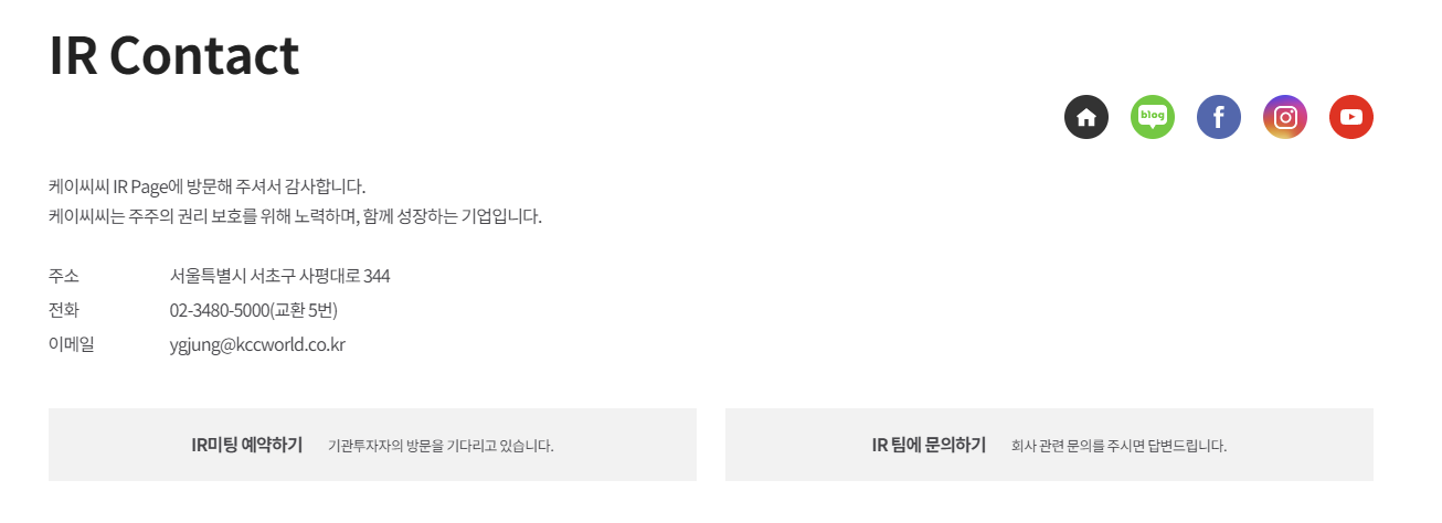 KCC는 이번에 오픈한 IR 전용 페이지를 통해 주주와 투자자 등 이해관계자들에게 기업의 경영활동 및 이와 관련된 회사의 자료를 실시간으로 공유한다. 기업의 메시지를 원문 그대로 배포하여 주주 및 투자자들에게 명확한 정보를 신속하게 전달함으로써, IR 홍보를 강화한다는 것이다. IR 페이지에 게재된 IR 보도자료는 네이버 증권을 비롯한 12개 증권사 홈트레이딩시스템(HTS)와 모바일트레이딩시스템(MTS) 등에도 동시에 게재된다. 또, 일반 주주 대상으로 진행하는 QnA 시스템과 기관투자자 등을 대상으로 하는 IR 미팅 예약 시스템, 뿐만 아니라, IR LETTER도 정기적으로 발행하며 주주 및 소비자와의 스킨십을 확대, 강화한다.