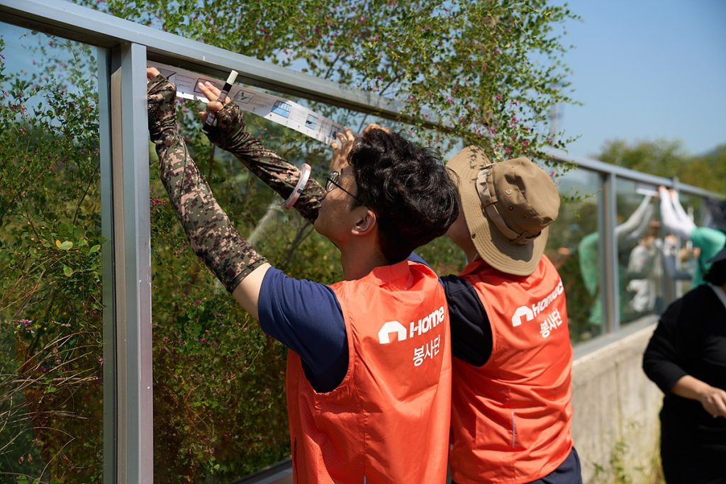 KCC글라스의 ‘홈씨씨 챌린저 봉사단’은 임직원의 자발적인 봉사문화를 조성하기 위해 지난해부터 운영되고 있는 자원봉사 프로그램이다. 임직원이라면 누구나 개별 팀을 구성하여 각자가 희망하는 봉사활동을 직접 기획해 참여할 수 있다. 이번 조류충돌방지 스티커 부착 봉사활동은 ESG경영팀 정유빈 사원의 주도로 기획됐다. 유튜브 ‘새덕후’ 채널을 통해 조류 유리창 충돌 사고와 저감 조치에 대해 알게 되었는데, 국내 대표 유리 제조 업체의 ESG경영팀 담당자로서 책임감을 느끼고 무엇을 할 수 있을지 고민했다고 한다. “최근 사회적으로도 이슈가 되었고, 타사에서도 관심을 가지고 있는 유리창 충돌 건을 보고 유리 제조업체인 KCC글라스에서도 도움이 되었으면 하는 마음을 가지고 이번 활동을 기획하게 되었습니다.”