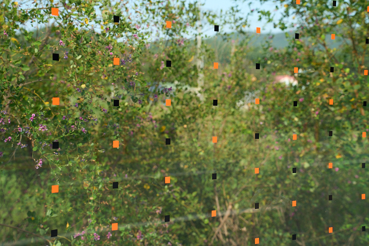조류충돌방지 스티커는 가로 10cm, 세로 5cm 간격의 점자형 스티커를 투명 장애물에 부착함으로써 조류가 이를 통과할 수 없는 공간으로 인식하게 해 충돌을 피할 수 있도록 돕는 스티커다.