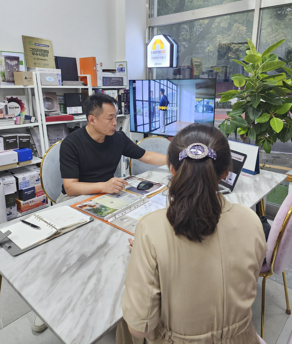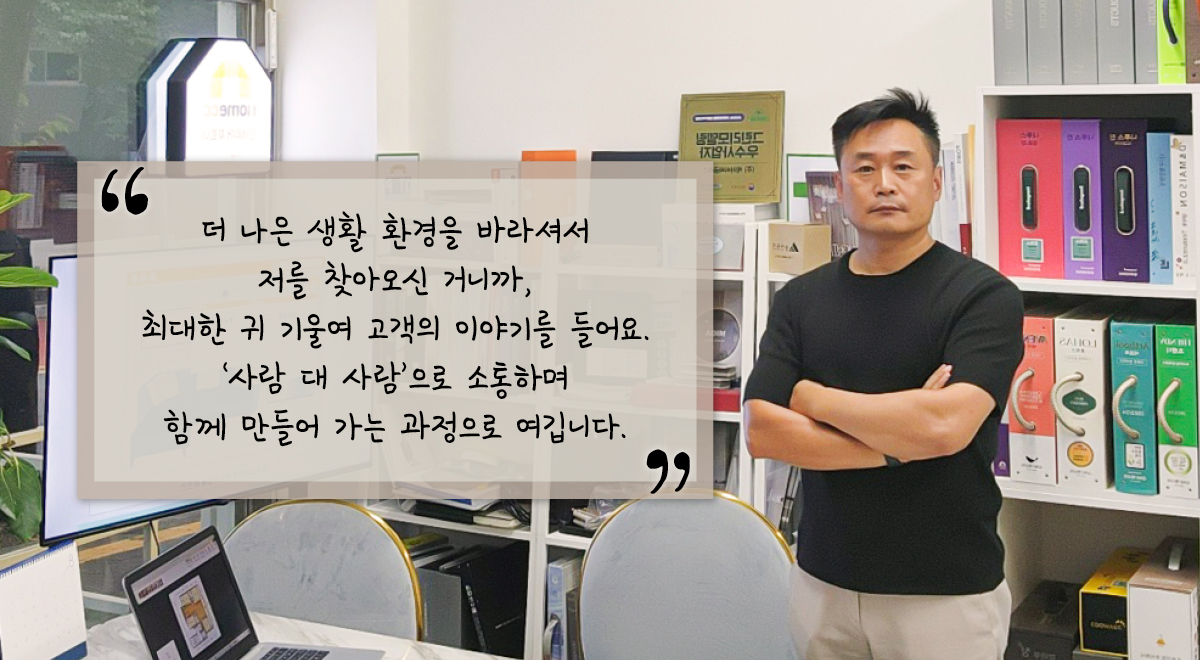 홈씨씨 인테리어와 함께하게 된 것도 자리를 잡는 데 많은 도움이 되었어요. 최근에는 홈씨씨 인테리어 광고를 보고 ‘어? 우리 집 앞에 있는데?’하고 생각이 나서 저희 사무실을 찾아오는 경우도 많아요. 대기업 브랜드이니까 더 믿고 맡길 수 있는 거죠. 홈씨씨 인테리어의 표준계약서와 표준시공 프로세스를 바탕으로 투명하고 꼼꼼하게 시공해 그 믿음에 보답하고자 항상 노력하고 있습니다.