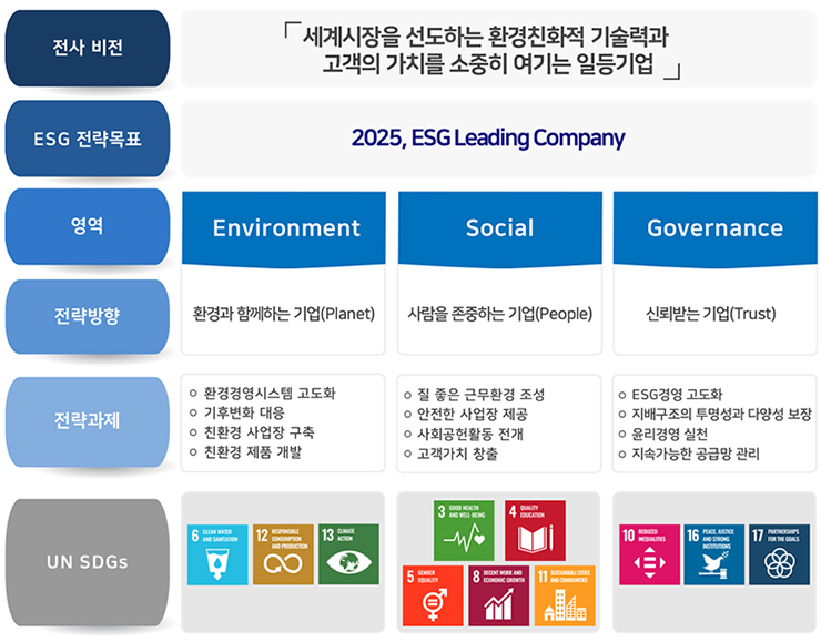 KCC글라스는 ‘세계시장을 선도하는 환경친화적 기술력과 고객의 가치를 소중히 여기는 일등기업’을 비전을 달성하기 위해 2025, ESG Leading Company라는 목표를 세우고 UN SDGs와 연계해 지속 가능한 영역별 전략과제를 수립하고 있다.