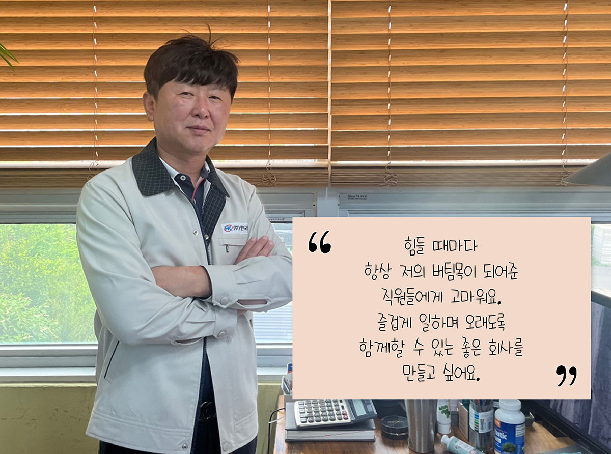 A: 그동안 회사를 성장시키기 위해 직원들과 함께 많이 노력해 왔어요. 힘든 일도 많아서 눈물도 많이 흘렸는데 그럴 때마다 직원들과 함께 서로 의지해 가면서 극복해 왔죠. 그렇기 때문에 저는 직원들을 가족같이 여기고 있어요. 지금은 사업이 어느 정도 자리를 잡아서 크게 바라는 건 없어요. 다만 힘들 때마다 항상 저의 버팀목이 되어준 우리 직원들이 행복하게 오래도록 함께할 수 있는 좋은 회사를 만들고 싶어요.
