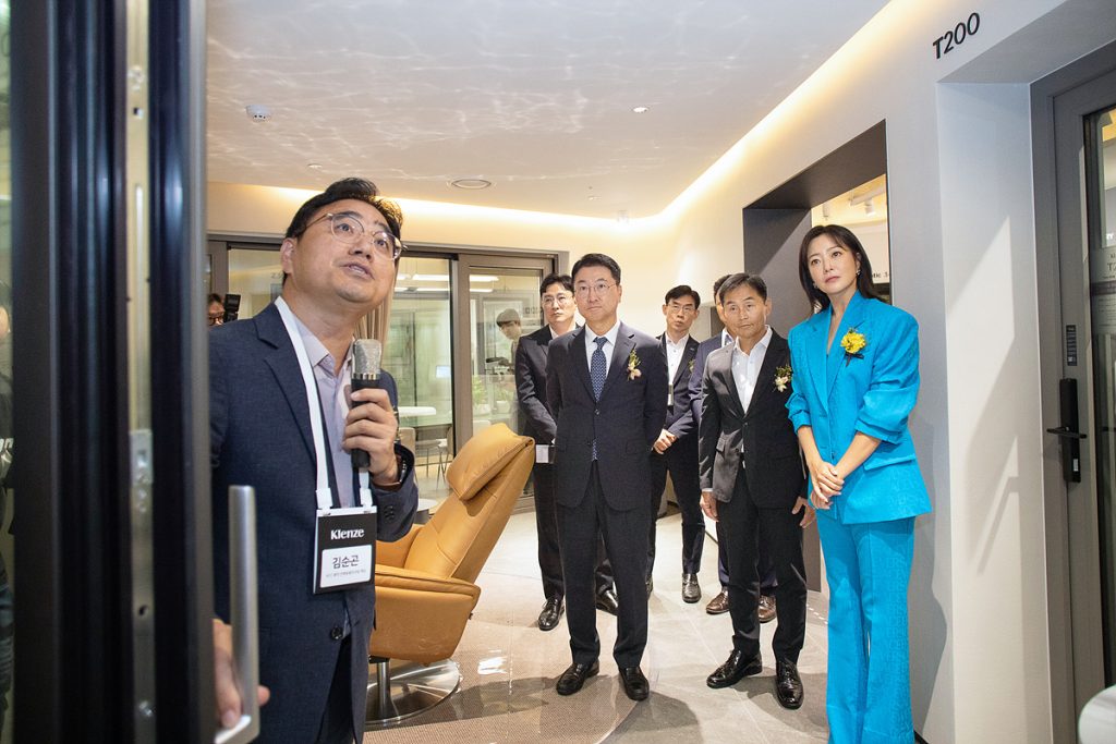 KCC는 지난 7월 13일, 하이엔드 창호 Klenze(클렌체) 전시장 ‘The Klenze Gallery(더 클렌체 갤러리)’오픈 기념 행사를 진행했다. 오픈 행사에는 Klenze 모델인 배우 김희선과 KCC 정재훈 사장, 건설사 임직원 및 조합 관계자, KCC 창호 대리점 대표, KCC 프로슈머 등 50여 명이 참석했다. 이날 행사는 정재훈 사장과 배우 김희선의 인사말에 이어 테이프 커팅, 전시장 투어, 기념 촬영 등으로 진행됐다. 공식 행사 전후로 참석자들은 전시장을 둘러보며 Klenze 주요 제품들에 많은 관심을 보였으며, 단열, 차음 등 창호 주요 기능에 대해 직접 체험해 보는 시간을 가졌다.