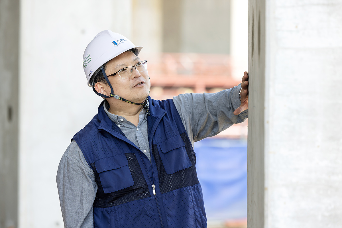 경기도 시흥시 정왕동에서 한창 공사중인 시화MTV 복합물류센터 KCC건설 현장. 램프 기둥과 보 슬래브 등 구조물에 적용된 PC(Precast concrete)를 꼼꼼히 살펴보는 이가 있다. 바로 이 현장에 PC 제품을 공급 및 설치하고 있는 (주)GPC의 온창윤 대표이사다.