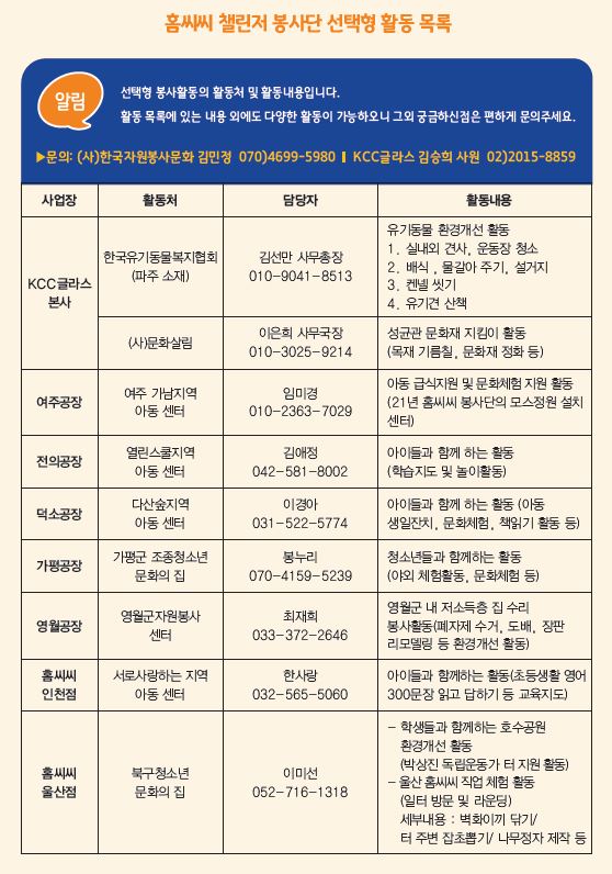 공모전에 선정된 팀 외에도 아래 표와 같이 다양한 홈씨씨 챌린저 봉사단 선택형 활동이 가능하다. 지난해 홈씨씨 챌린저 봉사단 활동에 참여한 직원들은 공통적으로 ‘회사를 통해 자원봉사를 쉽게 접할 수 있어 좋았다’는 반응을 보였다. 회사 동료들끼리 신청한 팀 외에 가족 단위로 신청한 경우도 있었는데, 그 중 한 팀은 ‘현 시대에 가족과 함께 무언가를 한다는 것이 쉽지 않은 일인데, 홈씨씨 챌린저 활동을 하며 뜻 깊은 시간을 보낼 수 있었다. 아이들에게 자연의 소중함을 가르칠 수 있는 시간이 되었다’는 소감을 남겼다고 전해진다. 아직은 소규모로 운영되고 있지만, 차차 많은 임직원들이 함께 참여할 수 있는 봉사단이 운영될 수 있기를 기대해 본다.
