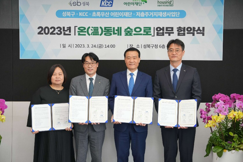 KCC(대표:정몽진)는 지난 24일 서울 성북구청과 부산 서대신 4동 주민센터에서는 ‘온(溫)동네 숲으로’와 ‘새뜰마을 사업’의 협약식을 각각 진행했다. 성북구청에는 이승로 성북구청장, KCC 김상준 상무를 비롯한 복지기관 관계자 10여 명이 참석했고, 부산 서대신4동 주민센터에는 국가균형발전위원회 이명섭 균형발전국장, 국토교통부 길병우 도시정책관, KCC 성웅수 상무 외 관계기관 담당자 20여 명이 참석하여 2022년도 사업결과를 공유하고 2023년 사업 운영계획 및 추진방향에 대해 논의했다.