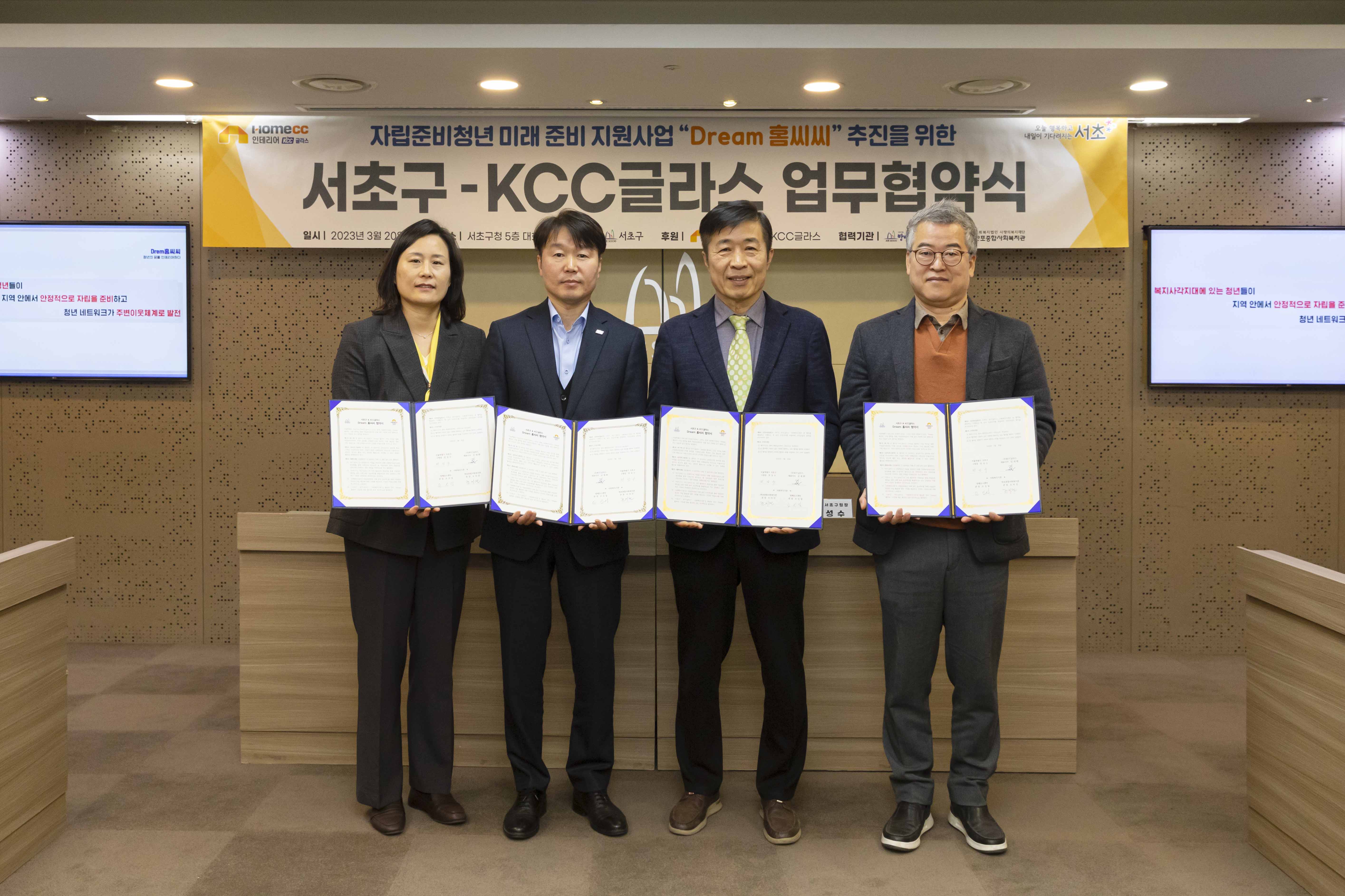 KCC글라스는 지난 20일 서울 서초구청에서 서초구, 방배유스센터, 반포종합사회복지관과 함께 Dream홈씨씨 사업 추진을 위한 업무협약(MOU)을 체결했다. 이날 협약식에는 김명주 KCC글라스 이사, 전성수 서초구청장, 오신일 방배유스센터장, 조미진 반포종합사회복지관장 등 관계자들이 참석한 가운데 진행됐다.
