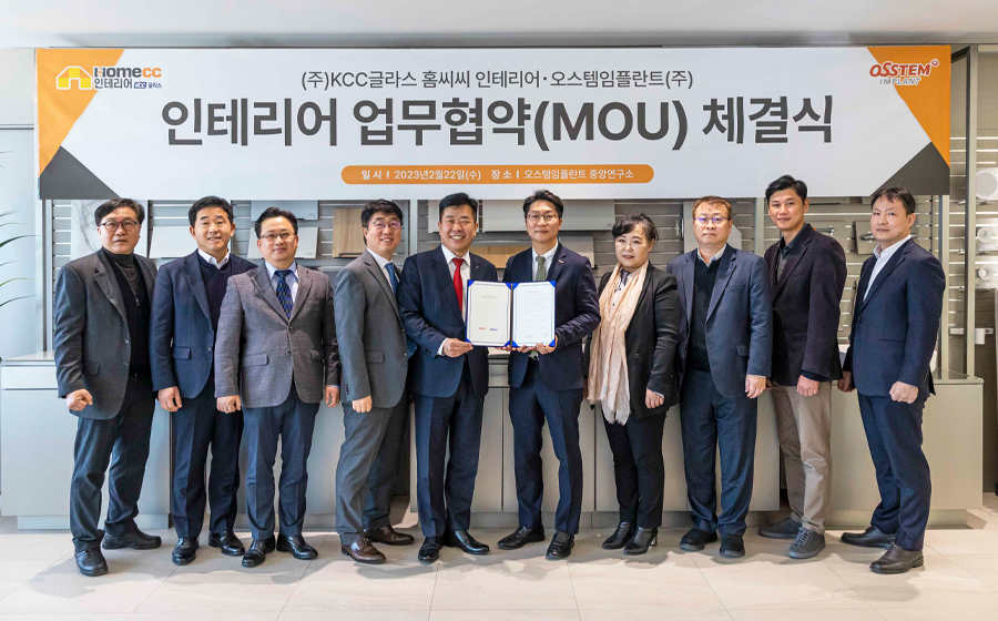 이를 위해 홈씨씨 인테리어는 지난 22일 서울 강서구에 위치한 오스템임플란트 마곡 중앙연구소 사옥에서 김덕신 KCC글라스 전무와 임정빈 오스템임플란트 인테리어사업본부장 등 양사 관계자가 참석한 가운데 병원 인테리어 사업을 위한 업무협약(MOU) 체결식을 가졌다.