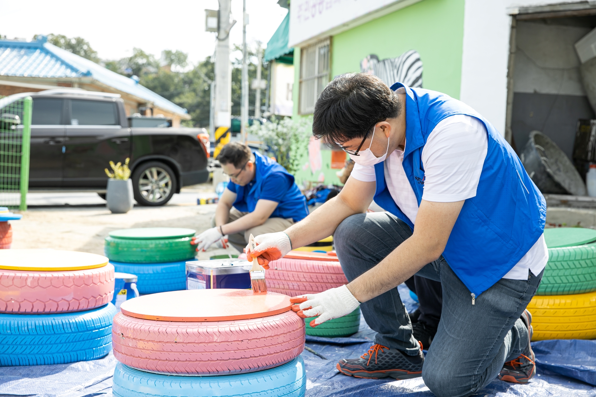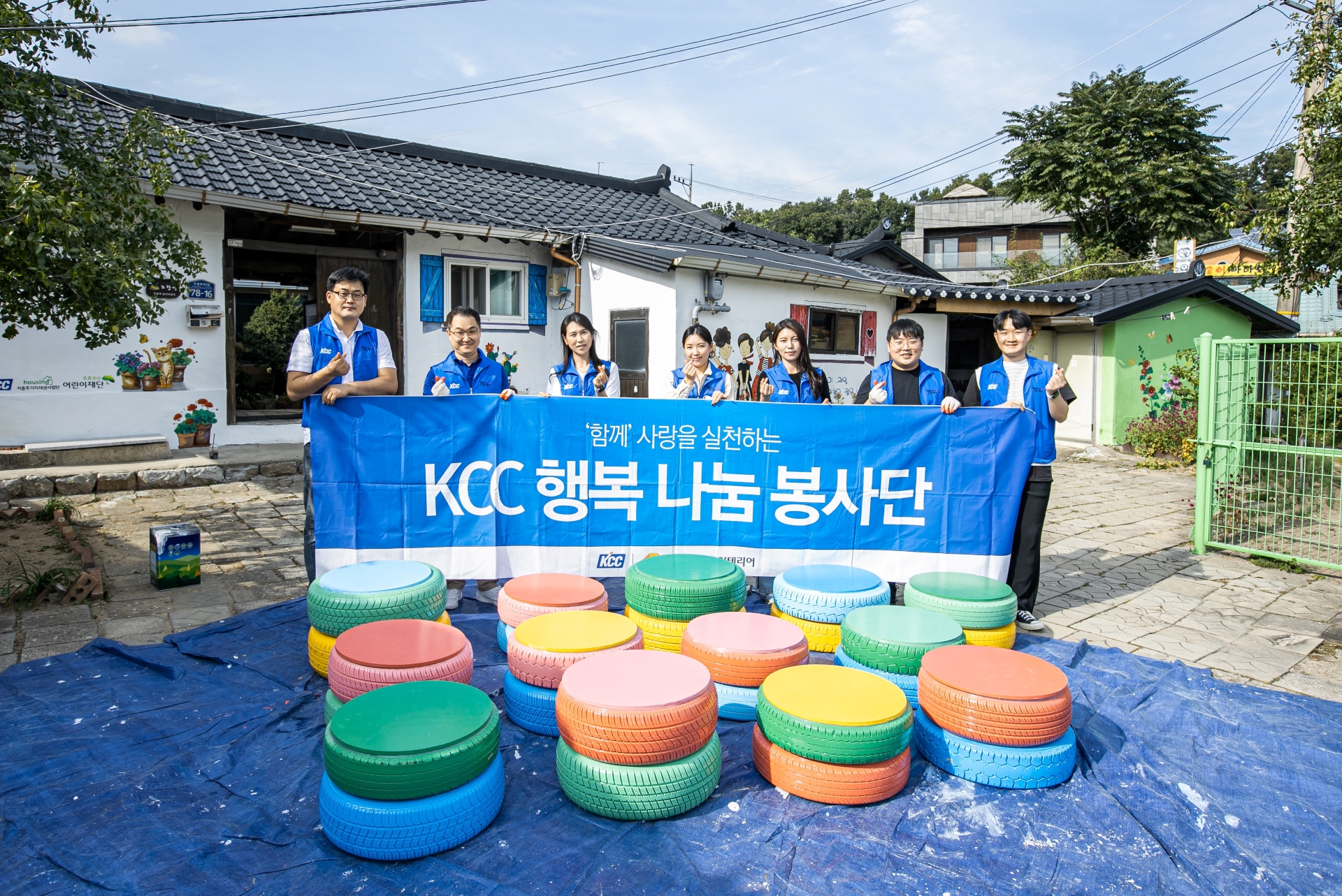 KCC가 지난 9월 28일 서울 도봉구 안골마을에서 사회공헌 사업인 ‘온(溫)동네 숲으로’의 일환으로 폐타이어 업사이클링을 진행했다. 이날 활동에는 KCC 임직원들이 참여해 폐타이어를 의자로 업사이클링 한 후 마을 곳곳에 배치하여 쉼터를 조성했다.