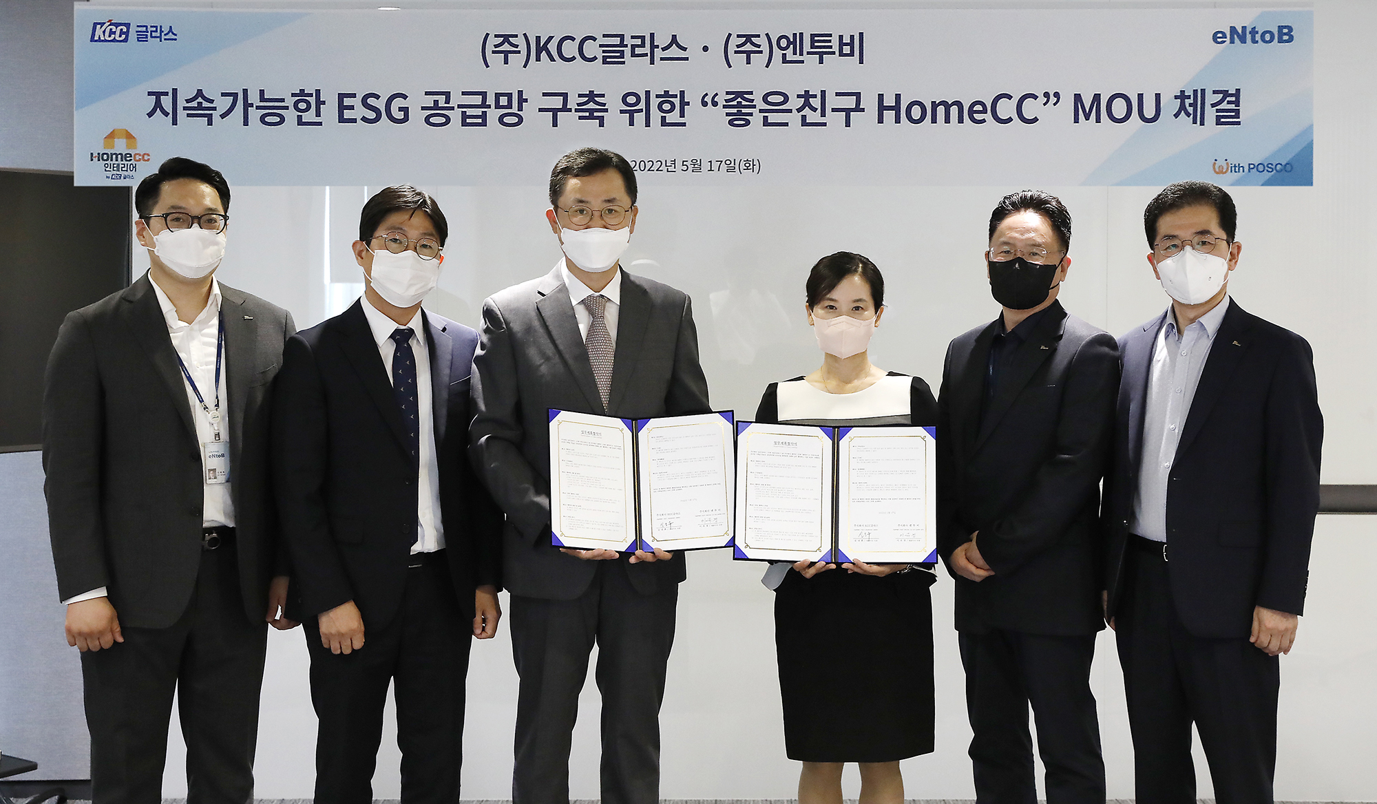 KCC글라스(회장 정몽익)는 포스코그룹 계열사인 ‘엔투비’와 지속가능한 공급망 구축을 위한 ‘좋은친구 홈씨씨(HomeCC)’ 업무협약을 체결하고 2차 공급사(중소 협력사)에 대한 ESG 경영 개선 활동에 나선다고 17일 밝혔다.