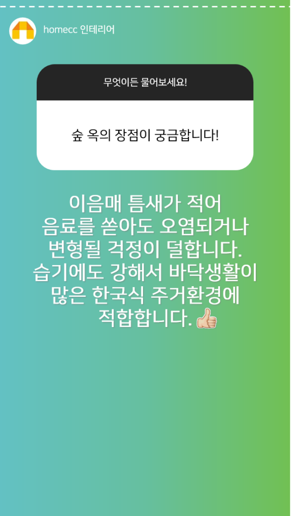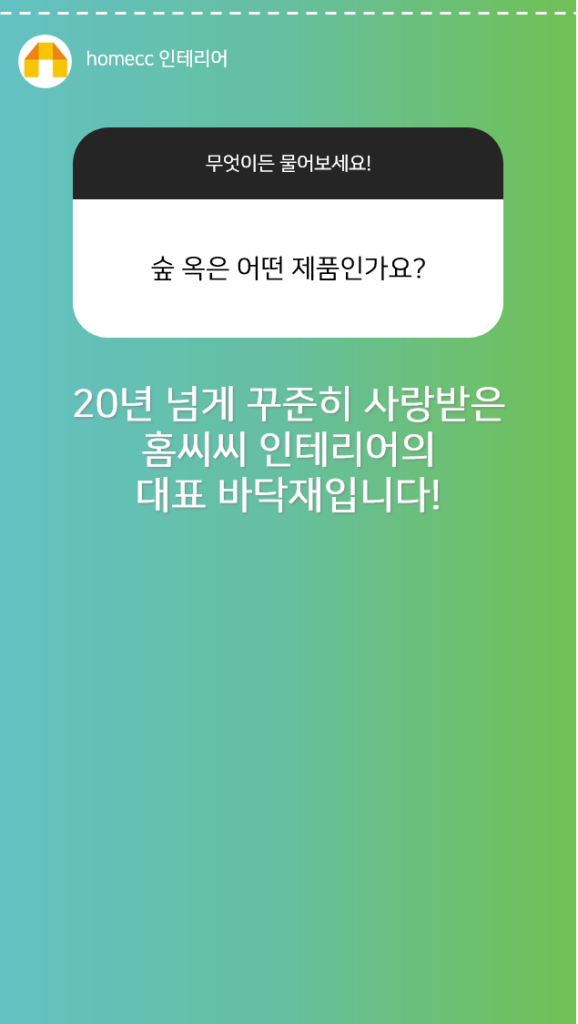 홈씨씨 인테리어가 친환경 바닥재 ‘숲 옥’을 리뉴얼하고 SPC 마루 ‘이지스스트롱’을 신규 출시하며 바닥재 라인업을 강화했다. 이를 기념해 ‘숲 옥’과 ‘이지스스트롱’에 관한 무물(무엇이든 물어보세요!)를 진행했으니, 다들 집중!