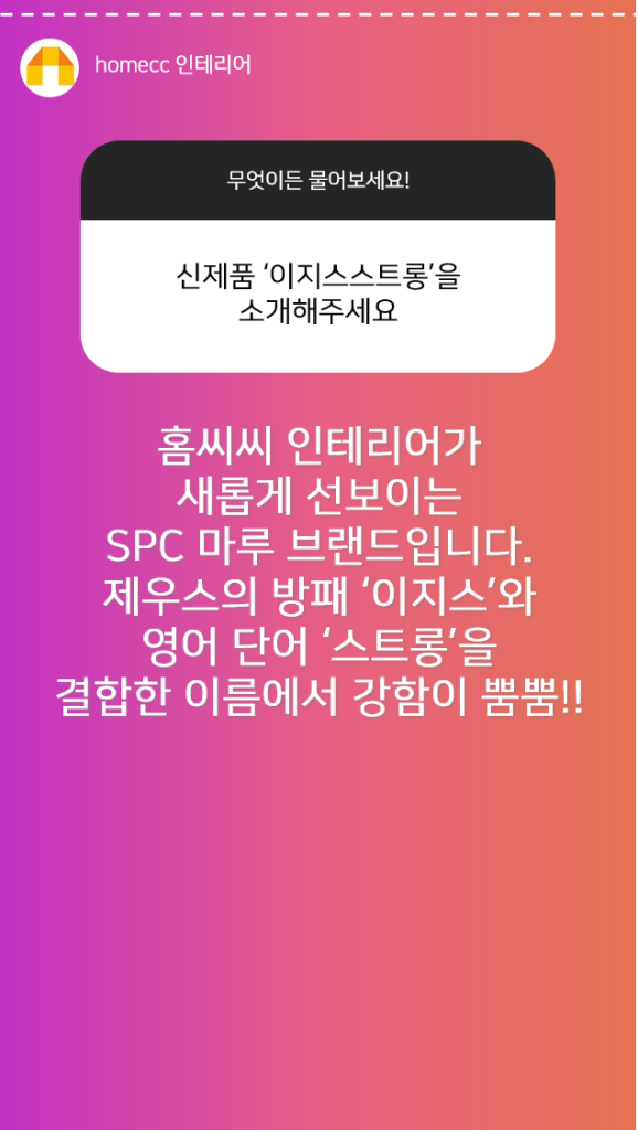 답: ‘이지스스트롱’은 홈씨씨 인테리어가 야심 차게 선보이는 신규 SPC 마루 브랜드입니다. 제우스의 방패🛡를 뜻하는 ‘이지스(EGIS)’와 ‘강함’💪을 뜻하는 영단어 ‘스트롱(STRONG)’를 결합한 이름으로, 습기와 표면 내마모성에 모두 강한 마루라는 의미를 담았습니다.