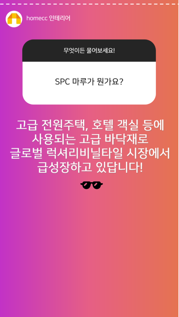 답: SPC는 Stone Plastic Composite의 약자로, 돌가루와 고분자 복합체가 배합된 SPC 소재를 적용해 습기에 강하고 표면 내마모성 뛰어난 신개념 바닥재입니다. 고급 전원주택, 타운하우스, 호텔 객실 리모델링 시장에서 수요가 높으며 현재 북미 시장을 포함한 글로벌 ‘럭셔리비닐타일(LVT)’ 시장에서 수요가 급성장하고 있습니다. 📈