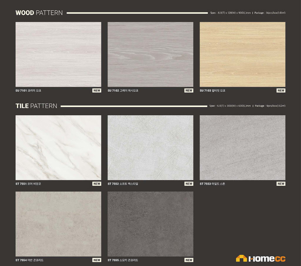 답: 우드와 스톤 등 다양한 소재의 총 20개 디자인 패턴이 구비됐습니다. 특히 동조엠보 기술을 적용하고 무늬의 반복을 최소화하는 등 천연 소재의 느낌을 현실감 있게 구현하려고 애썼습니다. 또 트렌드에 맞춰 공간을 시각적으로 넓어 보이게 하는 와이드 규격의 디자인 패턴도 대폭 추가해 소비자 선택의 폭을 넓혔습니다. 🔍