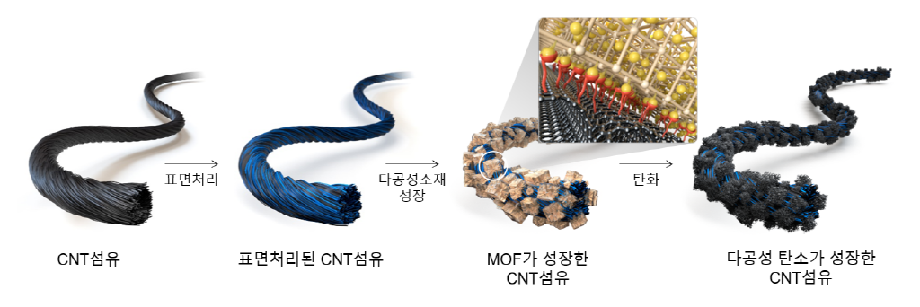 “사실 다기능성 탄소나노튜브 섬유는 2년간의 연구 끝에 2020년에 개발을 완료했습니다. 작년에는 그 결과를 논문화하는 데 집중했죠. 그러다 보니 후속 연구도 꽤 진행돼 있습니다. 기존에는 탄소나노튜브 섬유의 표면에 다공성 탄소를 입혔다면, 지금은 탄소나노튜브 섬유 사이사이에 비어 있는 공간에 다공성 탄소를 결합시킵니다. 덕분에 섬유의 표면이 매끄러워져 활용성도 한층 높아졌죠. 앞으로는 경제성 확보와 대량 생산에 주안점을 두고 추가 연구를 진행할 예정입니다.”