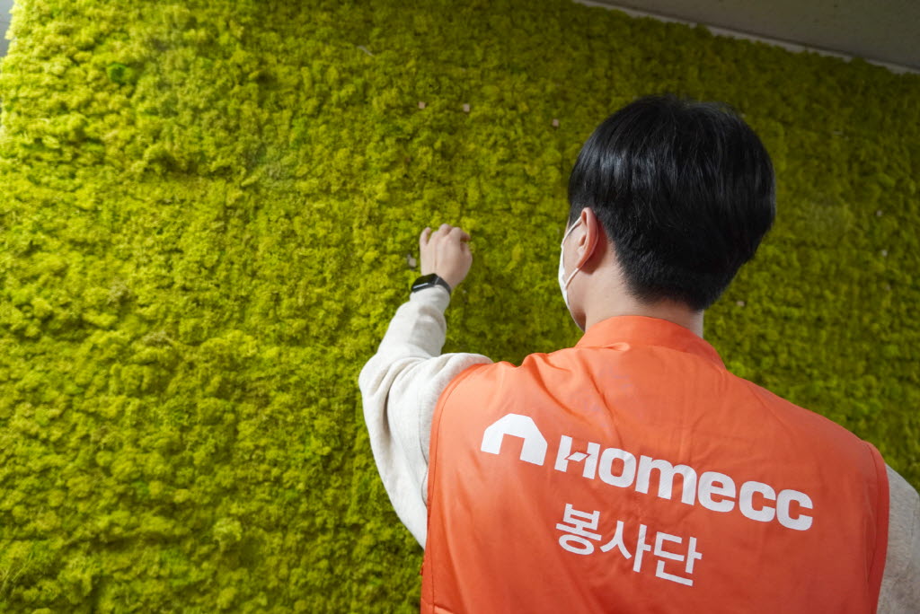 북유럽 고산지대에서 자라는 천연이끼인 스칸디아모스는 독특한 섬유질 구조로 실내 습도 조절과 공기정화에 탁월해 친환경 인테리어 재료로 각광받고 있다. 주황색 조끼를 입은 홈씨씨 봉사단은 센터 내 한쪽 벽면에 임직원들이 한 땀 한 땀 직접 만든 스칸디아모스 액자를 설치했다. 액자가 완성되자 밋밋했던 하얀 벽은 보는 것만으로도 기분 전환이 되는 싱그러운 연녹색으로 채워졌다.