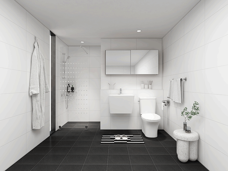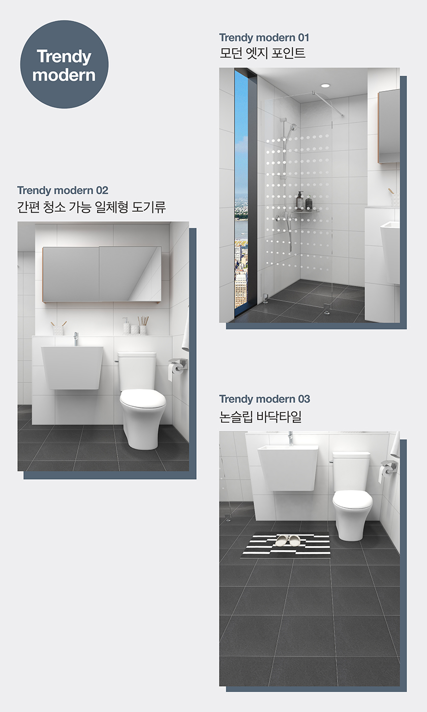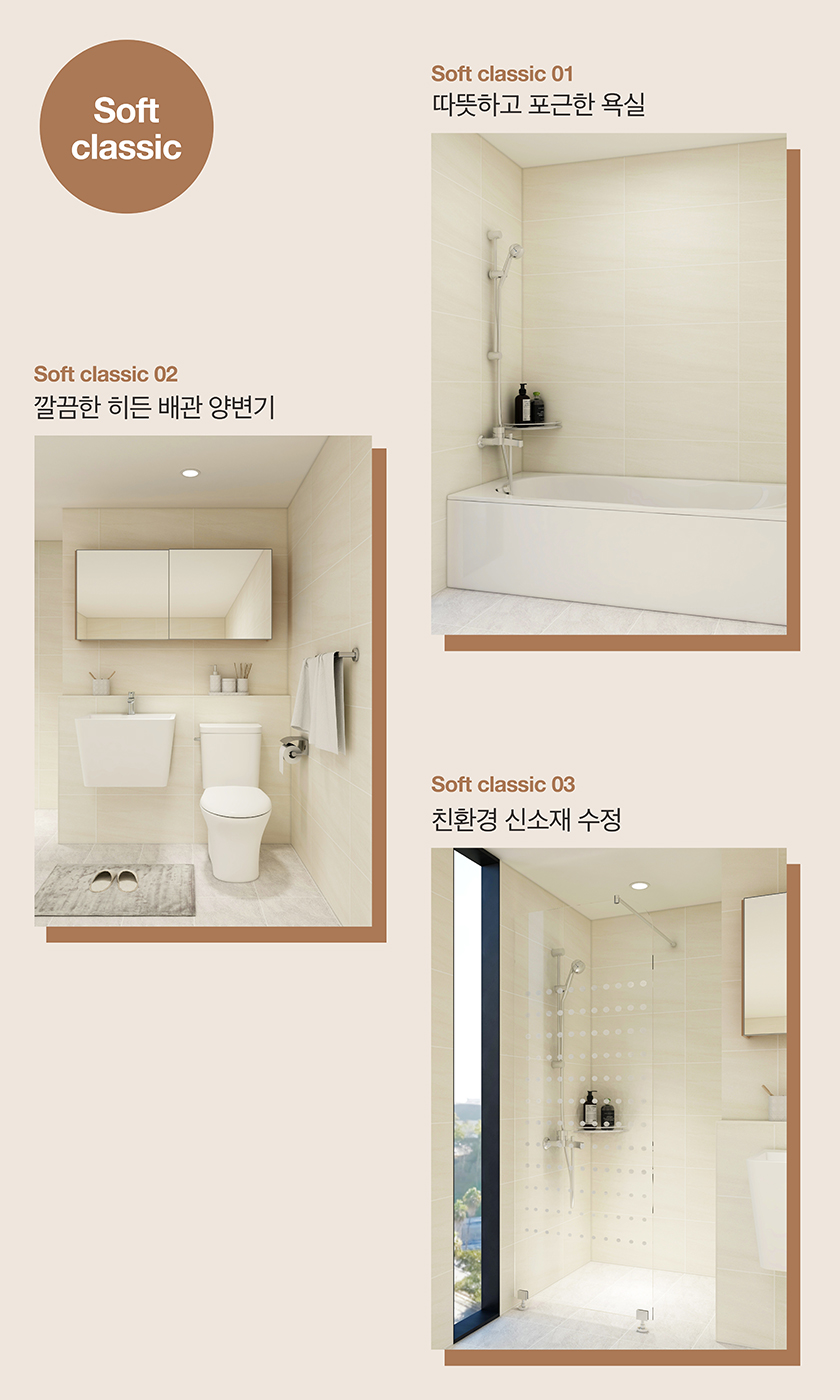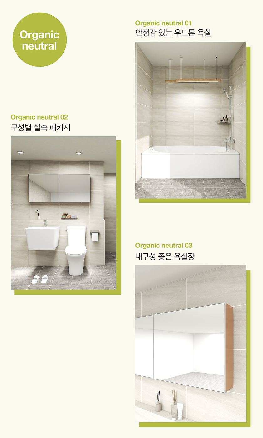 라이프스타일과 주거 트렌드가 변화함에 따라 고객들의 다양한 니즈를 충족시키기 위해 욕실 공간을 세분화했다. 욕조로 구성된 공용욕실, 파티션으로 구성된 부부욕실, 원룸이나 작은 평수의 주거공간에 적합한 소형욕실로 세분화하고 오가닉 뉴트럴, 소프트 클래식, 트렌디 모던 세 가지 스타일에 적합한 경쟁력 있는 제품들로 패키지를 구성했다.