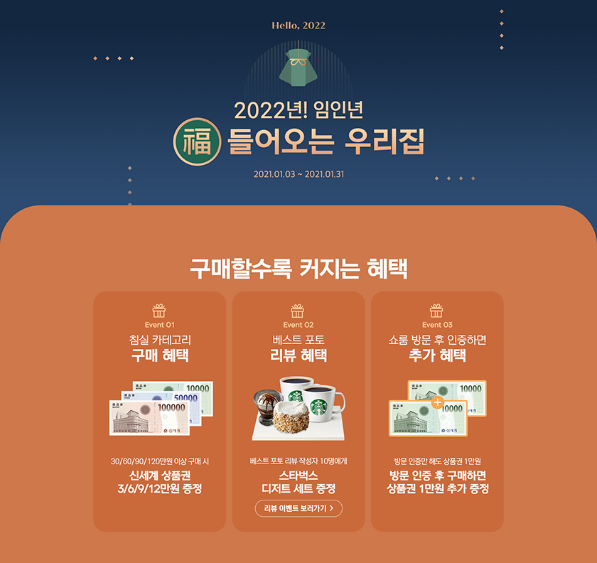 2022년 새해를 맞이해 복들어오는 우리집 인테리어 컨텐츠와 몰에서 구매할수록 혜택을 받을 수 있는 이벤트, KCC본사 1층 홈씨씨 인테리어 서초본점 방문 이벤트 및 베스트 포토 리뷰 이벤트가 1월 3일부터 31일까지 진행될 예정이다. 또한 1월 10일부터 회원가입 특별 이벤트도 진행된다. 신규가입회원 또는 기존가입회원 구분 없이 마케팅 수신 동의만 해도 다양한 혜택이 쏟아진다. 홈씨씨 멤버십 가입 시 해피콘 상품권(5천 원, 2천 명 추첨), 마케팅 수신 동의 시 CU 상품권(2천 원, 1천 명 추첨)을 추가 증정한다. 참여 방법 등 보다 자세한 이벤트 내용은 홈씨씨몰에서 확인할 수 있다.