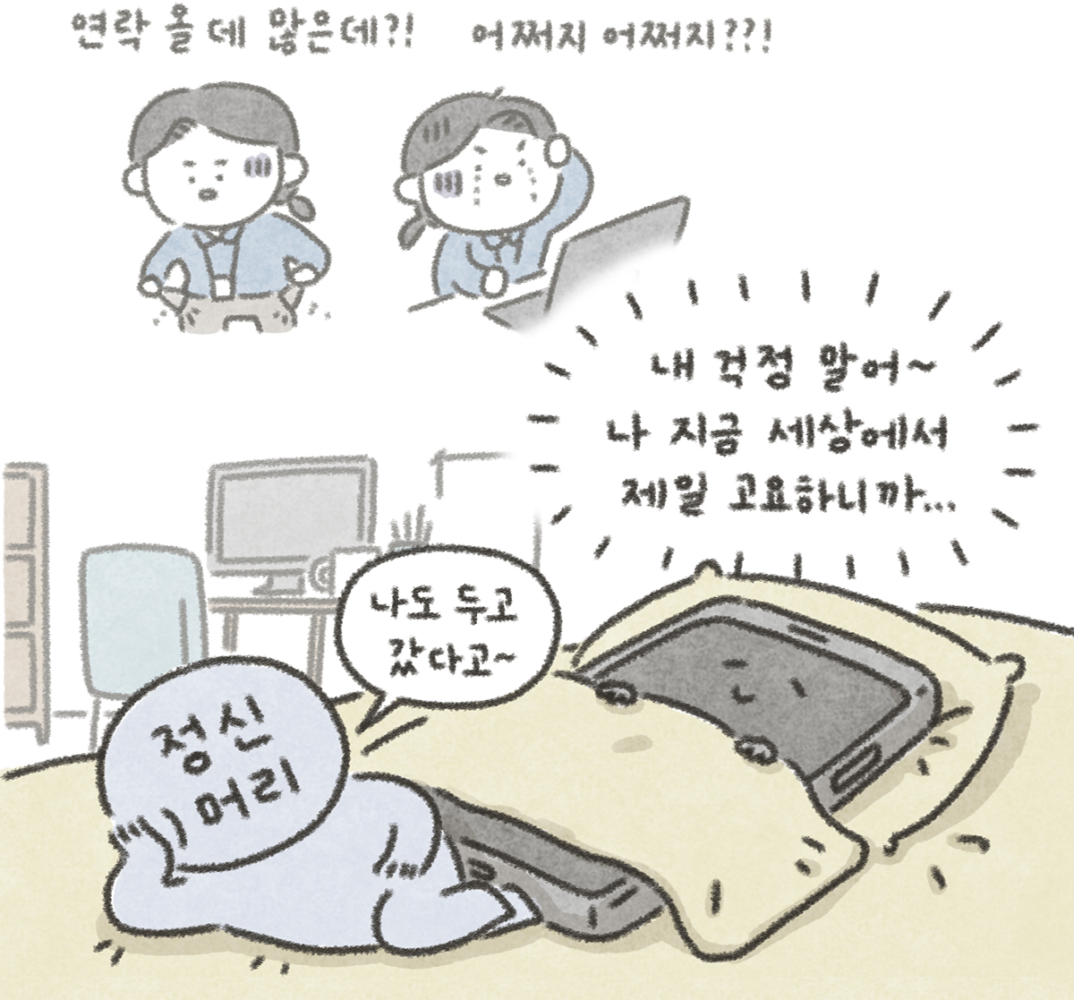 1월 케이씨씨 공감toon(케공감toon)의 주제는 ‘휴대전화를 두고 회사에 출근한 주인을 생각하는 휴대전화의 모습’입니다. 정신없이 바쁜 직장인들에게 종종 일어나는 헤프닝이지요. 바쁜 연말연시 다들 이런 경험 있으시죠? 포노사피엔스인 내 마음과는 상반되게 휴대전화는 생각보다 평온합니다. 하지만 다음부터는 꼭 데리고 출근하세요~!