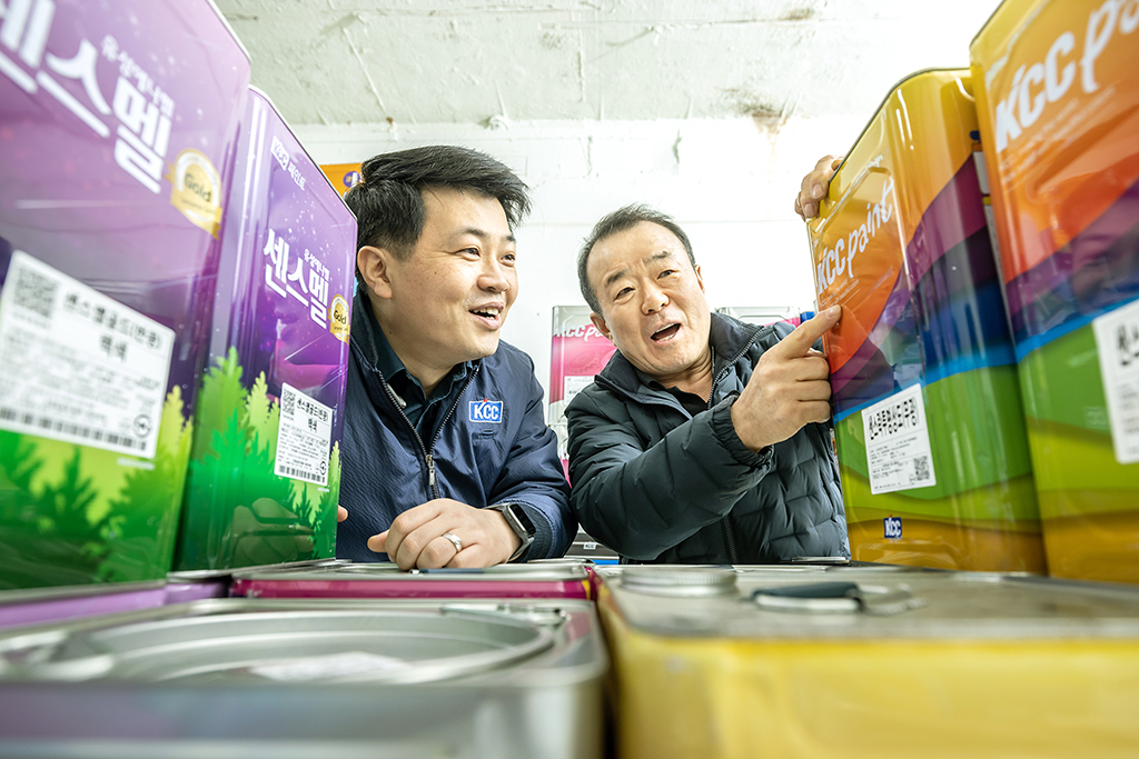 노재복 대표 전에는 페인트 캔 라벨에 색상이 ‘1000’, ‘2000’ 이렇게 숫자로 써 있있어요. 그런데 일반 고객들이 이 숫자만 보고 무슨 색인지 도통 알 수가 없는 거예요. 그래서 겉면에 컬러 명시를 건의했고, 지금은 ‘1000(백색)’, ‘2000(적색)’ 이런 식으로 명시되고 있죠. 또 2액형 페인트의 현장 사용편의성을 개선하기 위해 캔 모양 개량을 건의하기도 했지요. 현장의 목소리를 잘 전달하려고 노력했고 KCC에서는 이러한 건의들을 적극 수용했습니다.