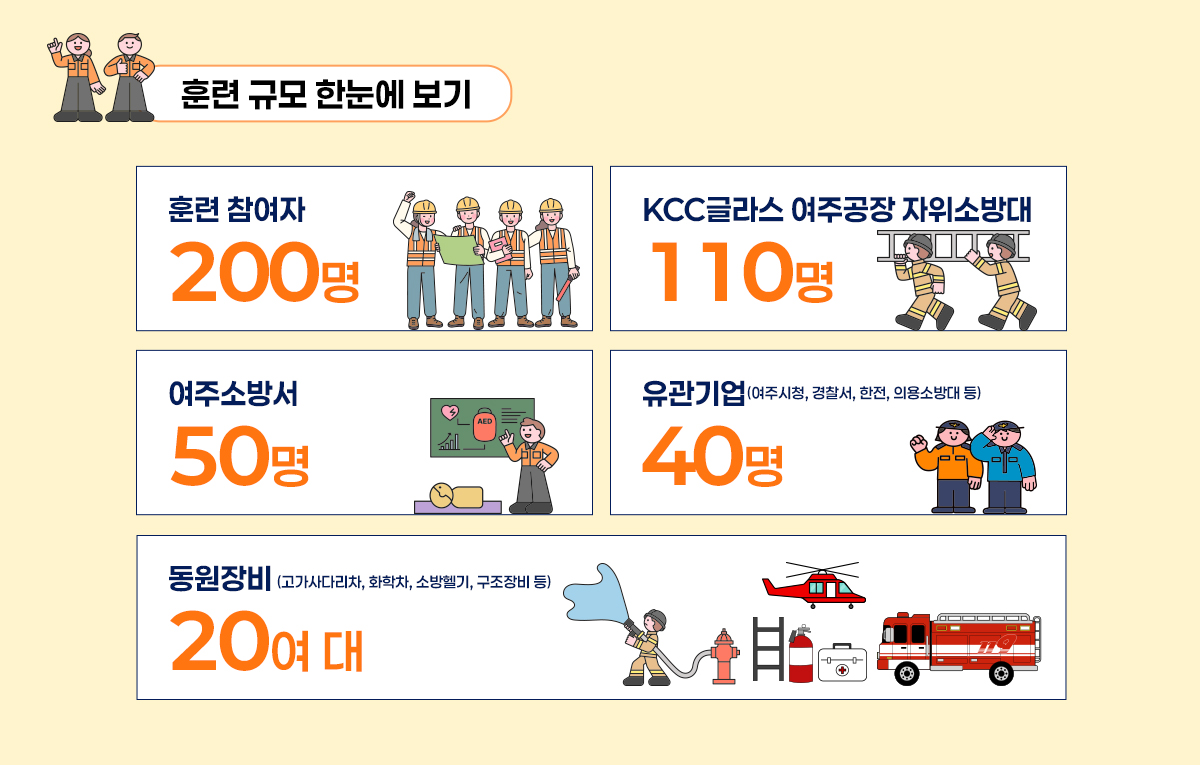 이날 훈련에는 KCC글라스 여주공장 구성원들로 이뤄진 자위소방대원 110명과 여주소방대원 50명을 비롯해 여주시청, 여주경찰서, 한국전력 여주지사, 여주시 의용소방대 등 관계자 총 200여 명이 참여했다. 여기에 고가사다리차, 화학차, 소방헬기 등 각종 차량과 장비 20여 대가 동원돼 실전 상황을 방불케 했다.