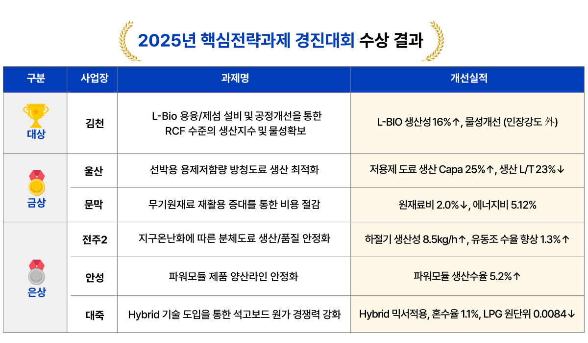 특히 2025년 CEO 경영방침과 공장장 품질경영 운영방침, 제품군별 성장전략을 기반으로 전 사업장에서 총 48개 부서가 참여해 13개의 핵심전략과제를 수행하며, 부문 간 협업을 통한 실질적인 성과 창출에 의미를 더했다.