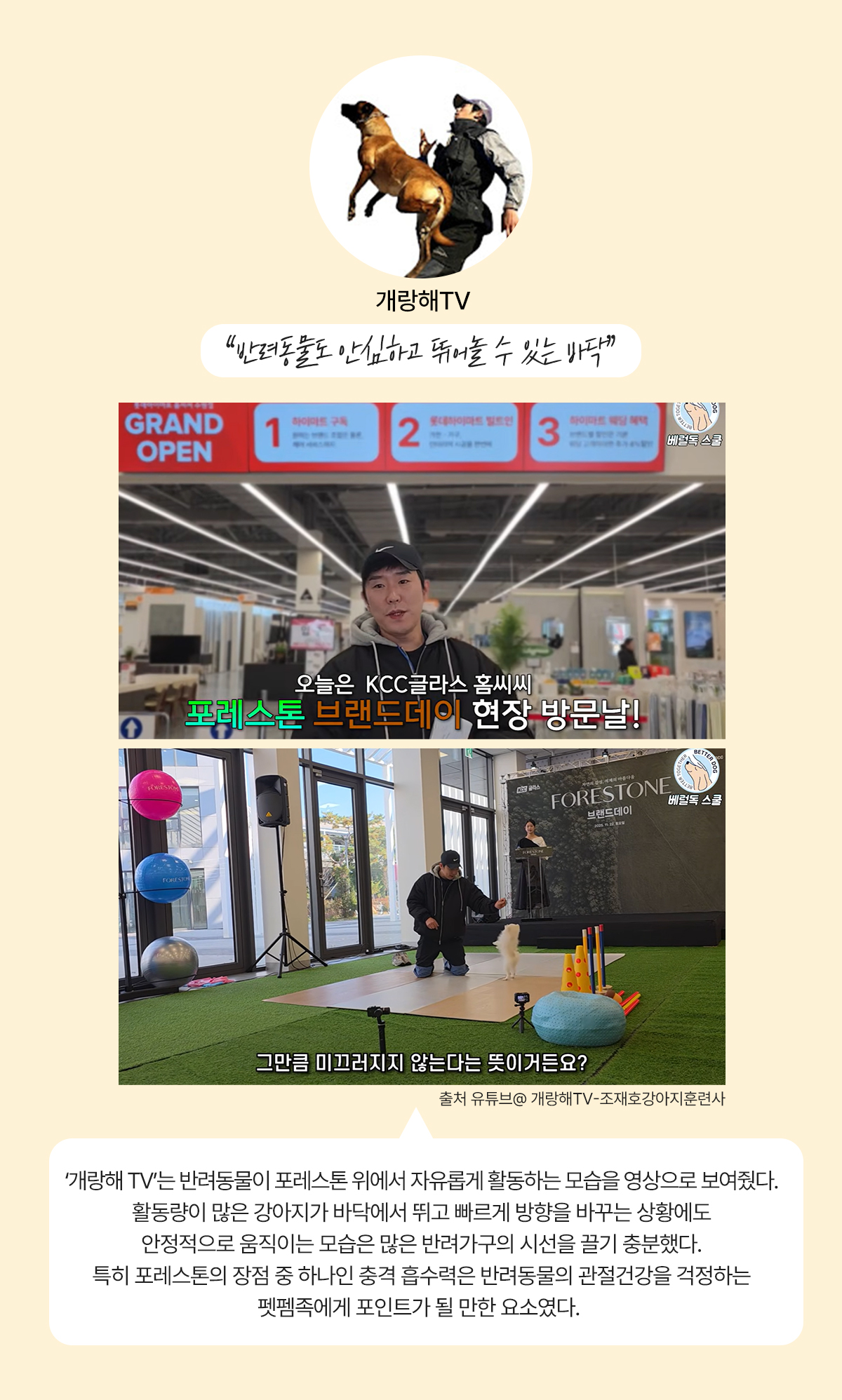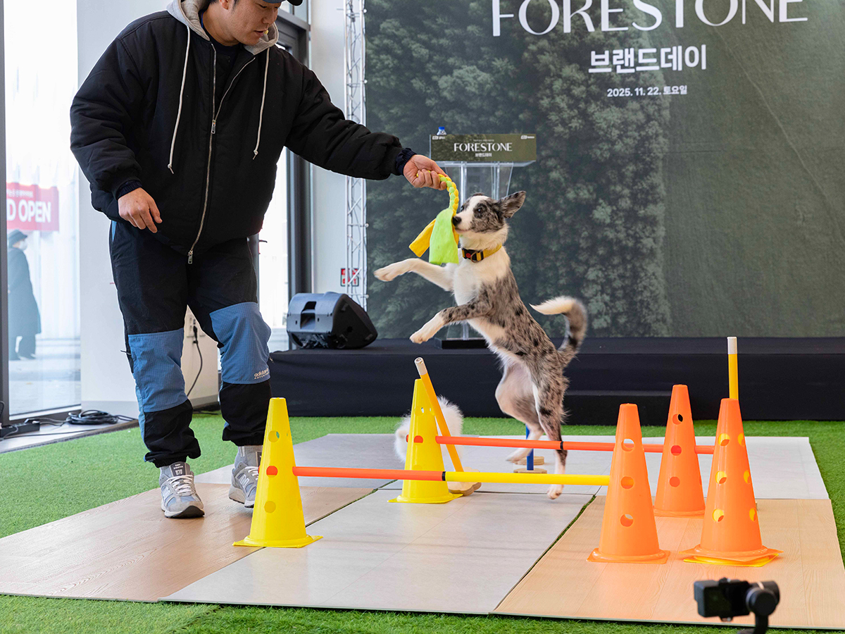 이번 브랜드데이는 제품을 진열해 보여주는 기존 전시 방식에서 벗어나, 직접 걷고, 움직이며, 실제 생활을 상상해보는 체험형 콘텐츠에 집중한 것이 특징이다. 요가매트 대신 포레스톤 위에서 진행된 요가 퍼포먼스와 반려동물 어질리티 프로그램을 통해 포레스톤의 미끄럼 저항성, 보행 안정성, 쿠션감 등 핵심 기능이 설명 없이도 자연스럽게 전달됐다.