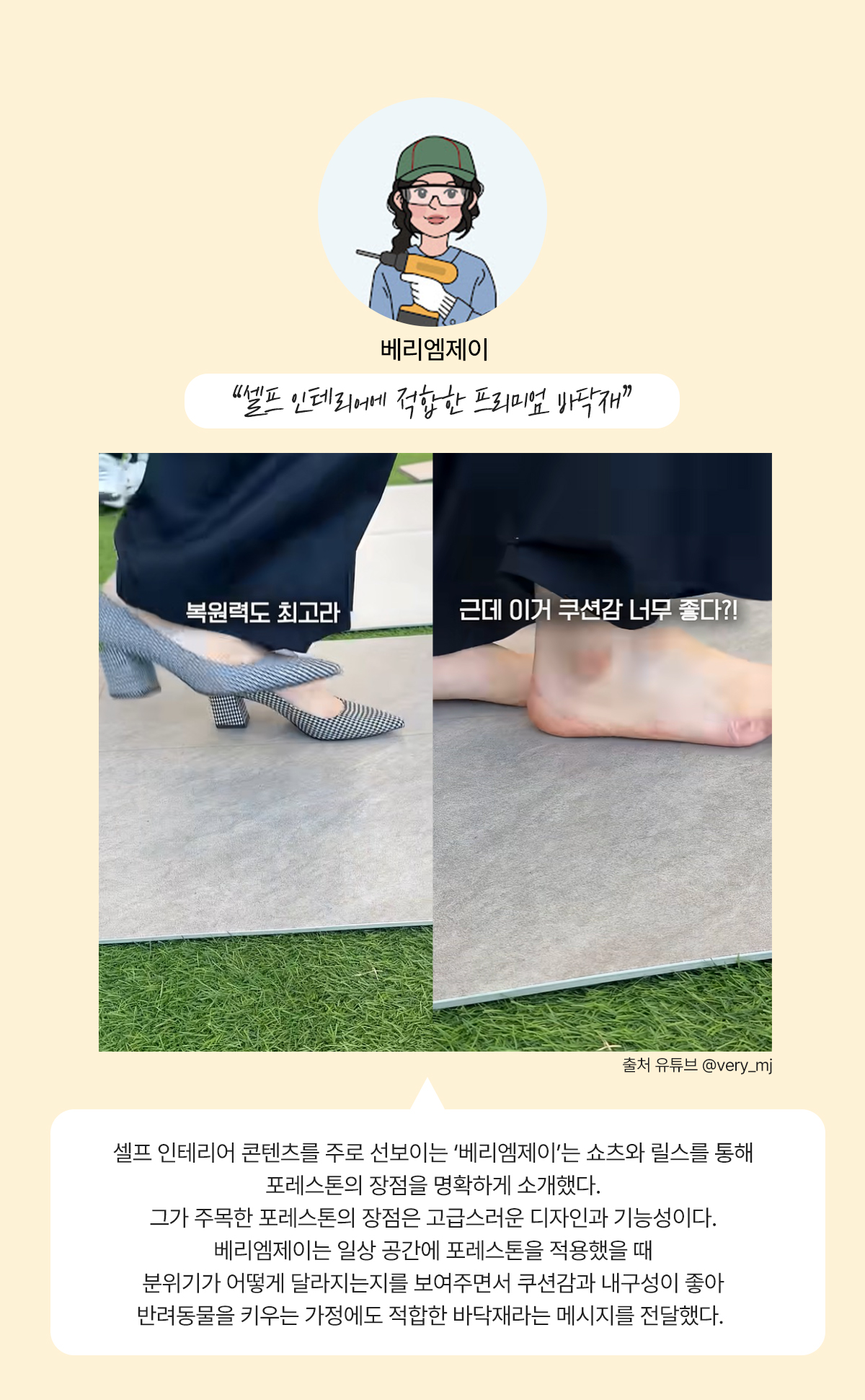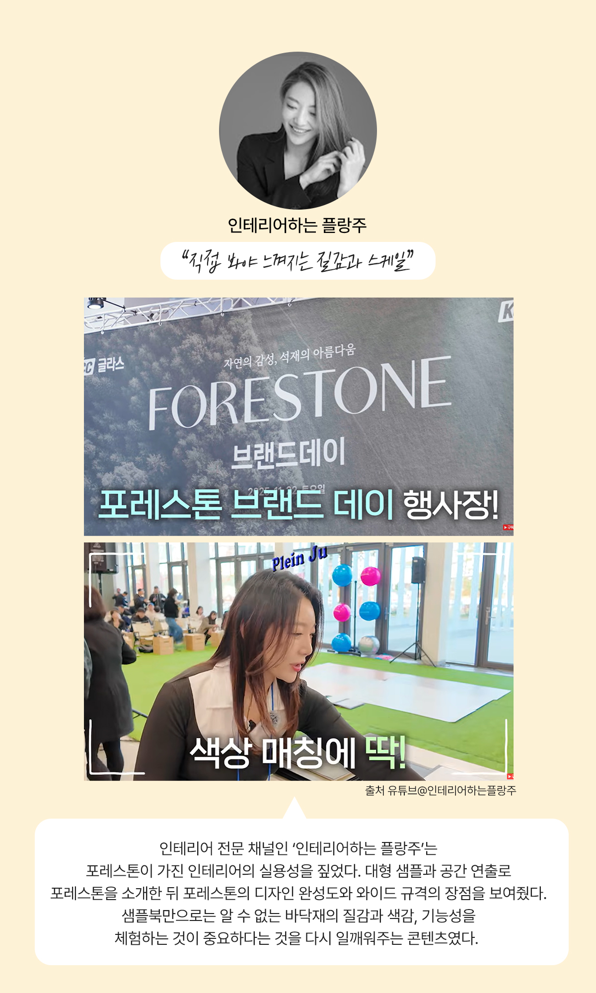 - 서로 다른 전문 분야의 인플루언서들이 각자의 시선으로 ‘포레스톤’을 경험한 콘텐츠를 통해 공감을 확장하고 바닥재 선택의 새로운 기준을 제시한다.