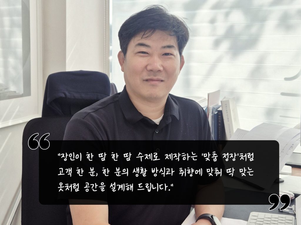 A. 인테리어의 매력은 사람의 삶을 바꿀 수 있다는 점이라고 생각합니다. 그 공간에서 살아가는 방식이 달라지고, 마음가짐이 달라지고, 때로는 가족의 관계까지 달라질 수 있다는 걸 경험하면서 제 일에 대한 자부심이 커졌어요. 기억에 남는 현장이 하나 있어요. 오래된 아파트였는데, 사춘기 자녀를 둔 한 어머님이 저희에게 리모델링을 맡기셨죠. 상담하면서 이런 얘기를 하시더라고요. 딸아이가 “엄마, 우리 집이 창피해서 친구 초대를 못하겠어”라고 말했다고요. 말씀하실 때 표정이 많이 안 좋아 보이셨어요. 혹시 이 집을 바꾸는 게, 마음에도 변화를 줄 수 있을까 싶어 더 신경 써서 작업했죠. 밝은 톤의 자재를 사용하고, 조명 위치도 바꾸고, 무엇보다 딸아이의 동선을 고려해서 방 구조도 조정했어요. 그리고 며칠 지나 그 고객분으로부터 연락이 왔습니다. “대표님, 딸아이가 방을 보더니 예쁘다면서 정말 오랜만에 ‘엄마 고마워’라는 말을 했어요.” 그 말을 듣는데 저도 울컥했죠. 집이라는 공간이 누군가에게 위로가 될 수 있다는 걸 새삼 느꼈습니다. 또 그 고객님께서 웃으시면서”돈 많이 벌어서 꼭 다시 의뢰 드릴게요”라고 하셨을 때, 이 일이 단순히 인테리어가 아니라 삶에 긍정적인 영향을 줄 수 있는 일이라는 걸 다시금 확신하게 됐습니다.