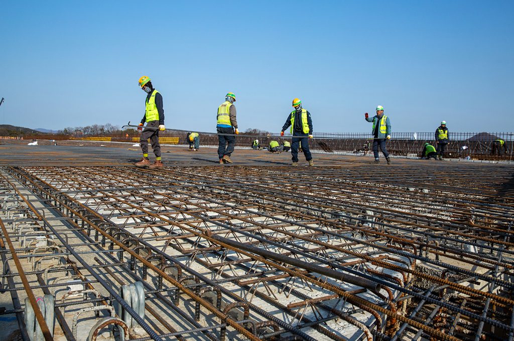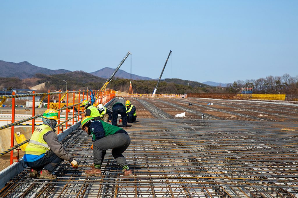 수신교 슬래브 철근 조립 작업이 안전 관리 기준에 따라 현장에서 진행되고 있다.