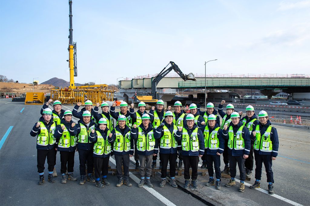 세종-안성 고속도로 현장 중 KCC건설이 담당하는 5공구는 가장 난도가 높은 구간으로 꼽힌다. 경부고속도로와 직결되는 동천안분기점이 있어 하루 10만 대 이상의 차량이 지나고, 분기점 교량 시공과 차로 확장을 위해 약 1.4km의 우회도로를 설치해야 했다. 게다가 모든 작업은 24시간 차가 달리는 고속도로 위에서 이루어졌다. 주간 작업은 애초에 불가능해 밤 10시부터 다음 날 새벽 4시까지 어둠 속에서 사투를 벌여야 했는데, 시간 특성상 고속으로 달리거나 전방에 부주의한 차량이 많아 늘 사고 위험에 대비해야 했다. 심지어 주행 차로를 통제하며 작업해야 했던 만큼 모든 구성원은 매 순간 긴장을 놓을 수 없었다. 구성원들은 이 극한의 환경을 철저한 안전 수칙으로 돌파했다. 근로자와 관리감독자를 1:1로 매칭해 밀착 관리하고, 모든 근로자는 바디캠과 현장식별띠를 착용했다. 안전모에 붙인 현장 식별 띠는 멀리서도 근로자임을 확인할 수 있어 현장을 안전하게 지키는 데 큰 도움이 됐다.