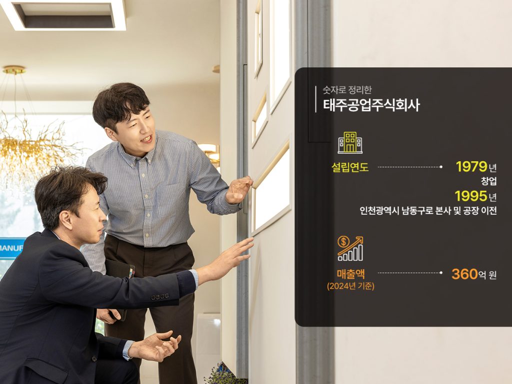크게 엣지형 조명(슬림한 두께의 엣지 구조로 제작된 LED 조명), 매립형 라인 조명(천장면에 매립되어 공간을 넓고 정돈된 느낌으로 연출할 수 있는 조명), 서스펜션 및 펜던트 조명(디자인 중심 제품군으로, 심플한 원형 또는 직선형 실루엣과 메탈릭하고 매트한 질감 마감이 특징), 스마트 조명 및 디밍 조명(스위치 및 홈네트워크·홈패드 시스템 연동 조명으로 세대 내 조명 시스템 전체 연계 설계 및 디밍 대응 제품)을 생산하는 태주공업㈜. 무엇보다 공간에 특화된 다양한 조명기구를 직접 기획·디자인·개발·생산함으로써 공간의 이미지를 차별화하고, 품질력을 유지하며, 납기를 준수하는 것을 원칙으로 한다.