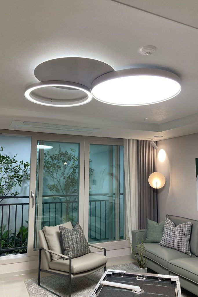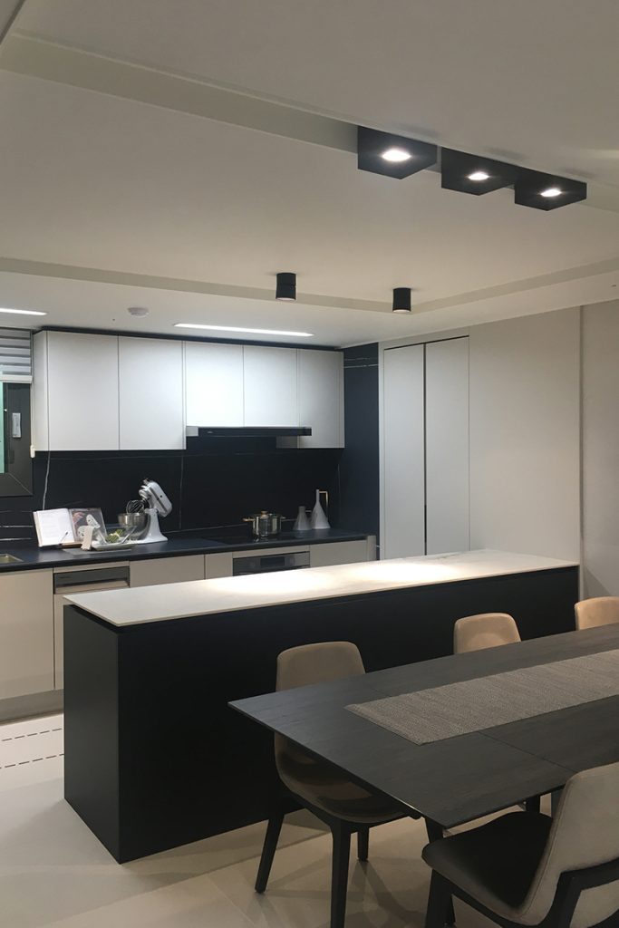 가장 최근 태주공업㈜이 KCC건설과 협업한 현장은 동해 프라우드 스위첸과 서광교 파크 스위첸이다. 30년 동안 한결같이 협업을 하면서 호흡을 맞춰온 두 기업이지만 매너리즘에 빠지지 않고 항상 새로운 시도를 통해 발전하는 행보를 이어왔다. 최근 진행한 협업 역시 마찬가지다. 동해 프라우드 스위첸에는 거실 조명등 프로젝트를 진행했는데 원형의 모듈 조명을 설치해 한층 모던하고 세련된 분위기를 연출했다. 주방 조명 프로젝트에 참여한 서광교 파크 스위첸 역시 마찬가지다. 흔히 주방조명은 펜던트 형을 많이 적용하는데 이 제품이 식탁의 모양이나 크기 등과 조화를 이루기가 쉽지 않아 보다 유연하게 자유롭게 조명을 움직일 수 있는 레일형으로 설치했다.