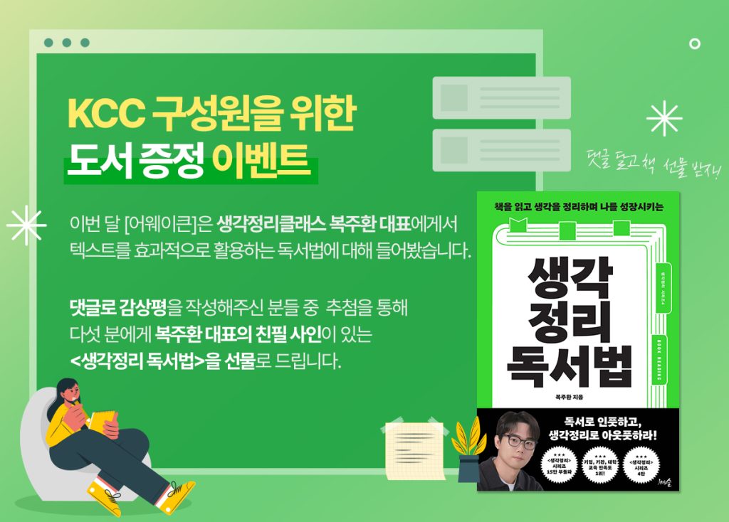 Q. 대표님께서 추천해주신 독서법 중 KCC구성원들이 꼭 실천했으면 하는 독서법이 있다면 무엇인가요?